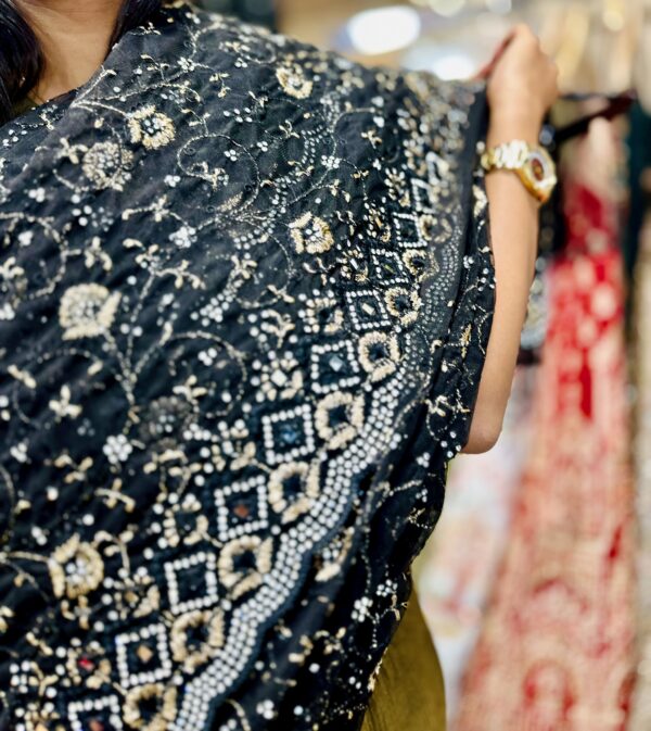 Make a dazzling statement with this glittery teal-colored saree adorned with intricate golden embroidery, designed to turn heads at any celebration. The rich teal hue beautifully complements the shimmer of the fabric, while the detailed gold threadwork adds a regal touch. Ideal for weddings, receptions, and festive gatherings, this saree blends traditional craftsmanship with a touch of glamour. Pair it with a matching or contrast embroidered blouse and gold accessories for a stunning, complete look.