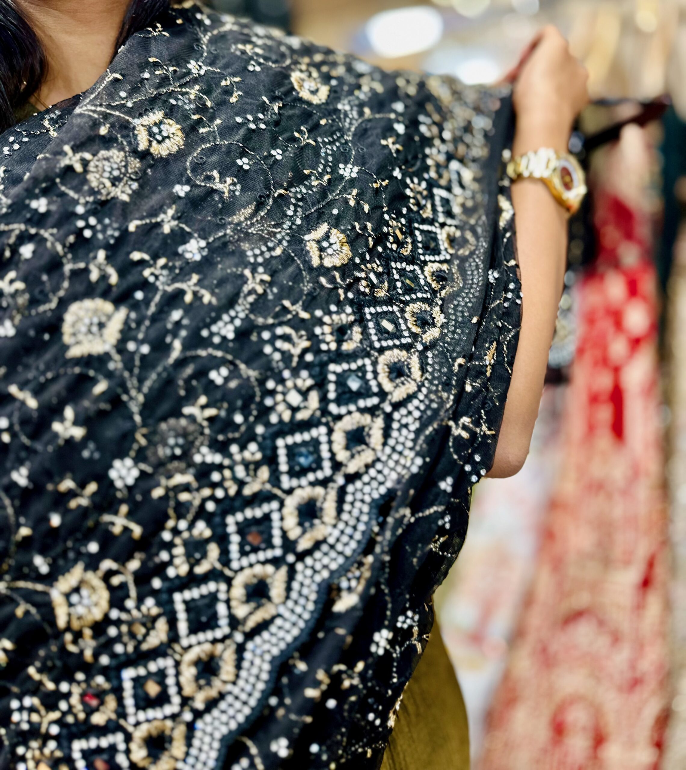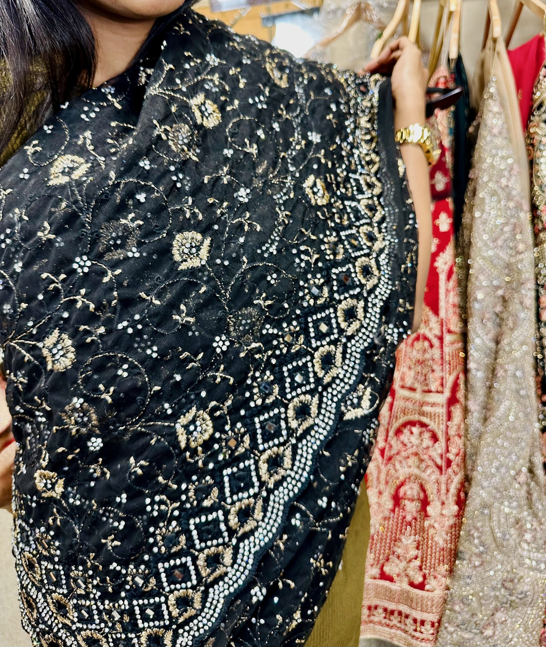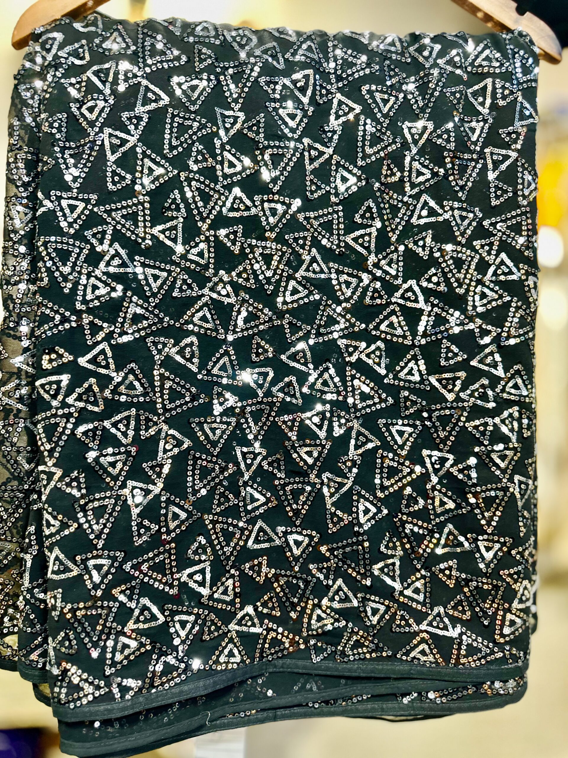Make a dazzling statement with this glittery teal-colored saree adorned with intricate golden embroidery, designed to turn heads at any celebration. The rich teal hue beautifully complements the shimmer of the fabric, while the detailed gold threadwork adds a regal touch. Ideal for weddings, receptions, and festive gatherings, this saree blends traditional craftsmanship with a touch of glamour. Pair it with a matching or contrast embroidered blouse and gold accessories for a stunning, complete look.