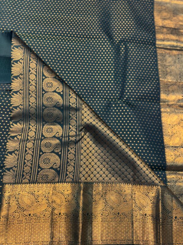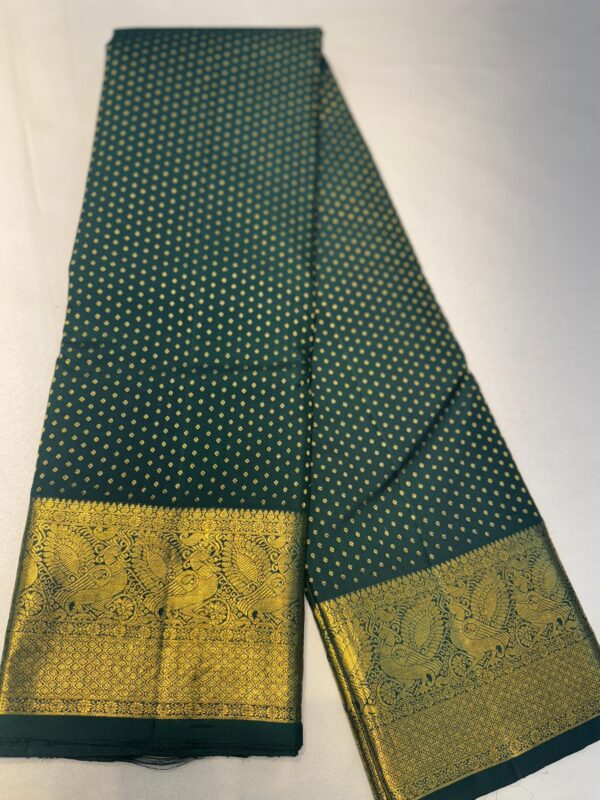 - Design: The body features a classic chevron pattern, leading to a grand pallu embellished with intricate peacock motifs.