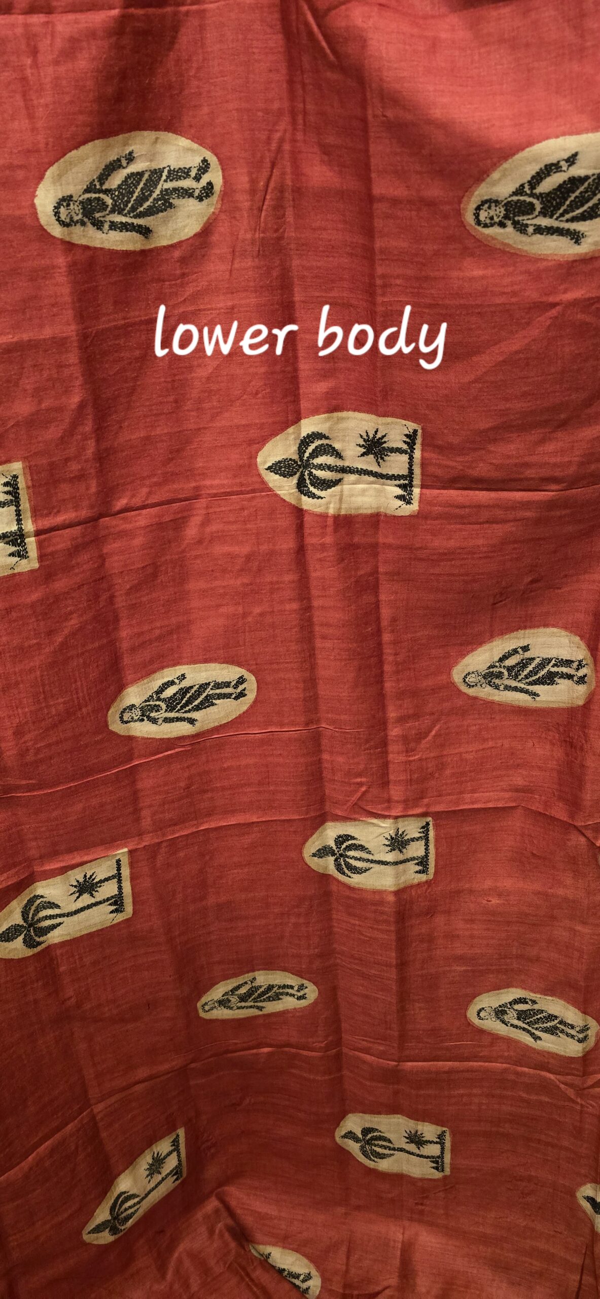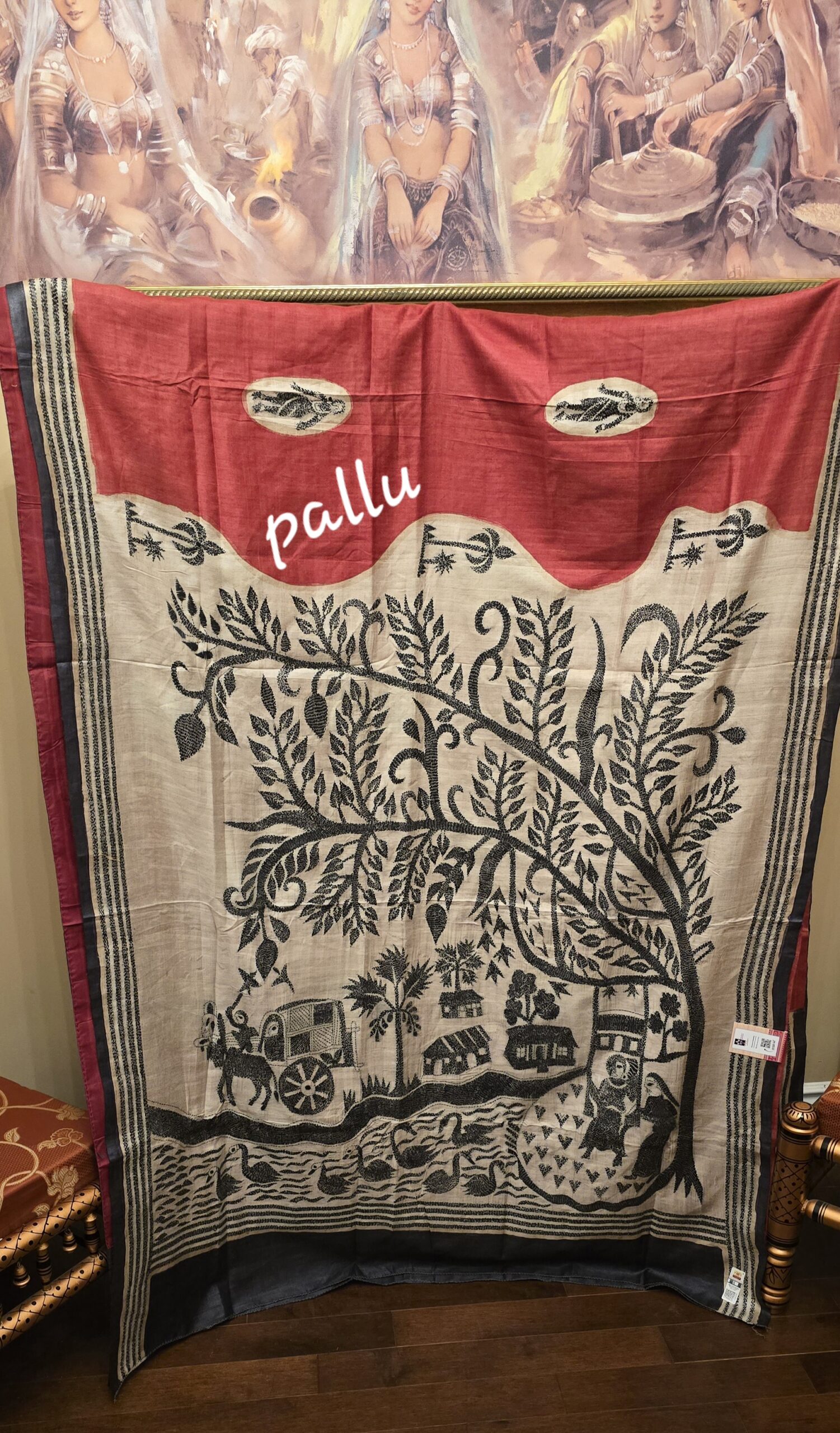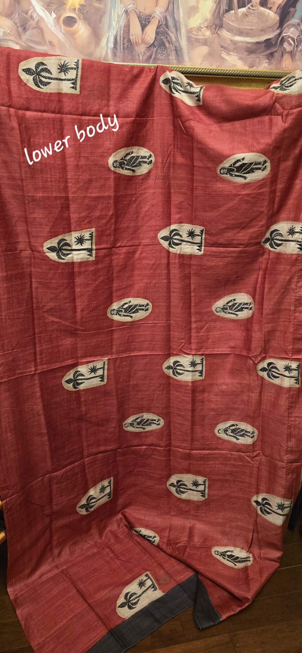 This saree is made of pure tussur silk . The saree is dyed in dusty pink colour and has been filled with village and palm tree motifs.