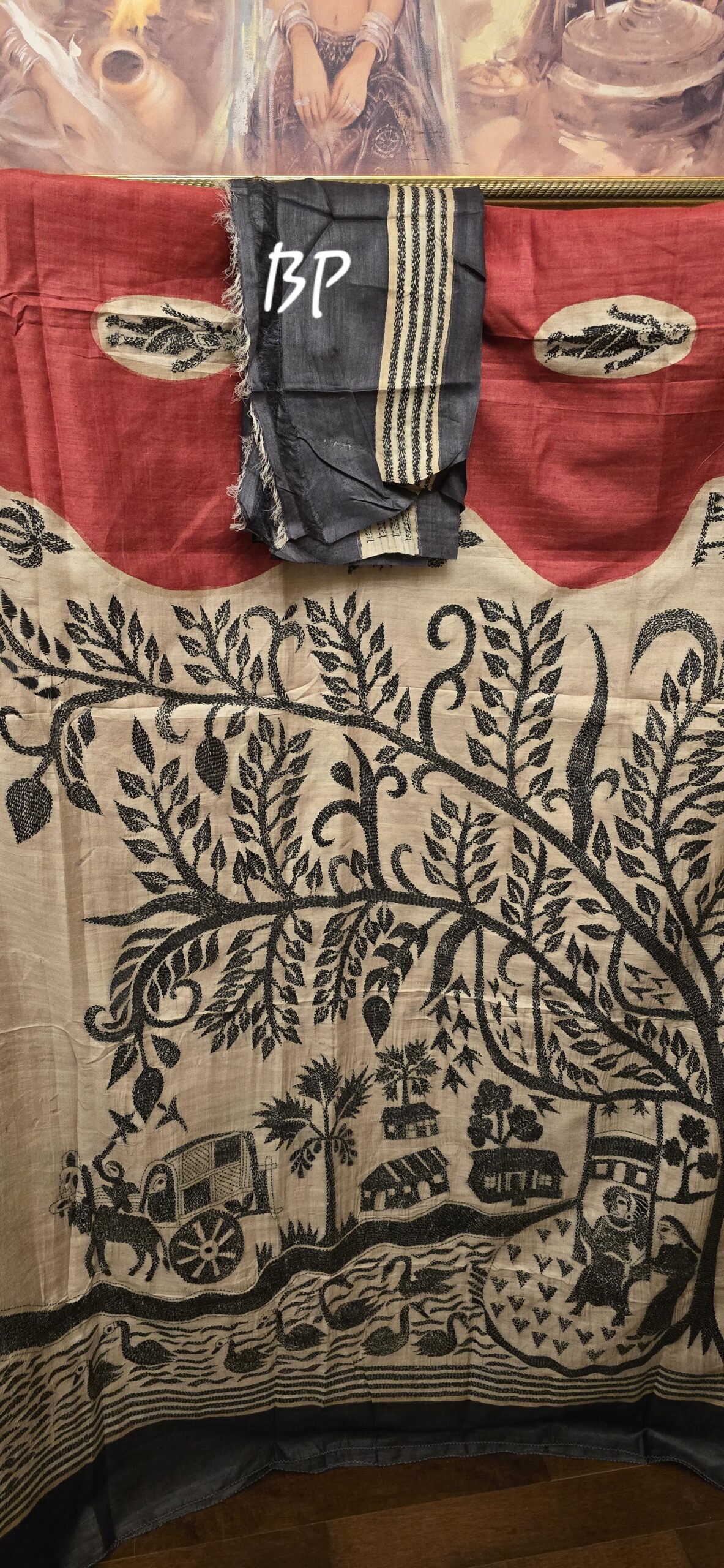 Kantha is the embroidery style from the Bolpur-Santiniketan regions of Bengal . The kantha work, characterized by the ‘running stitch’ is always done by hand, usually by women, and the elaborateness and intricacy of the embroidered patterns indicate how ‘heavy’ or ‘light’ the saree is.