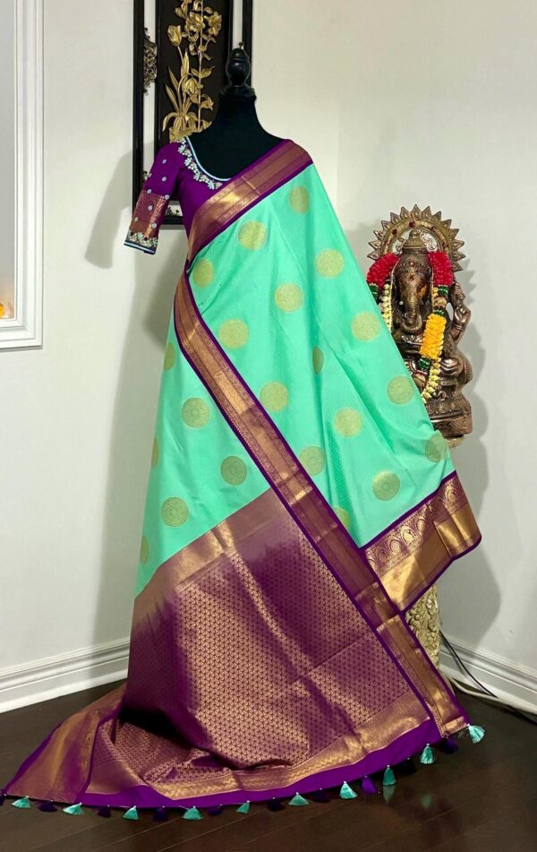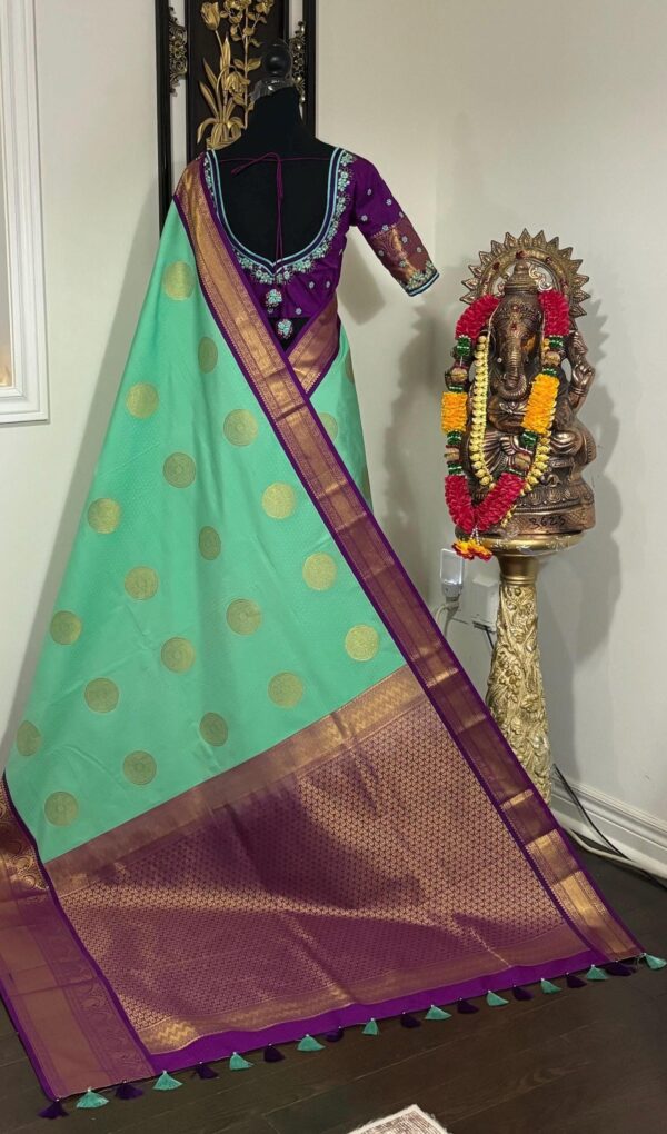 kanchipuram silk saree with rare color combinations with ready to wear work blouse that first to 34 to 46