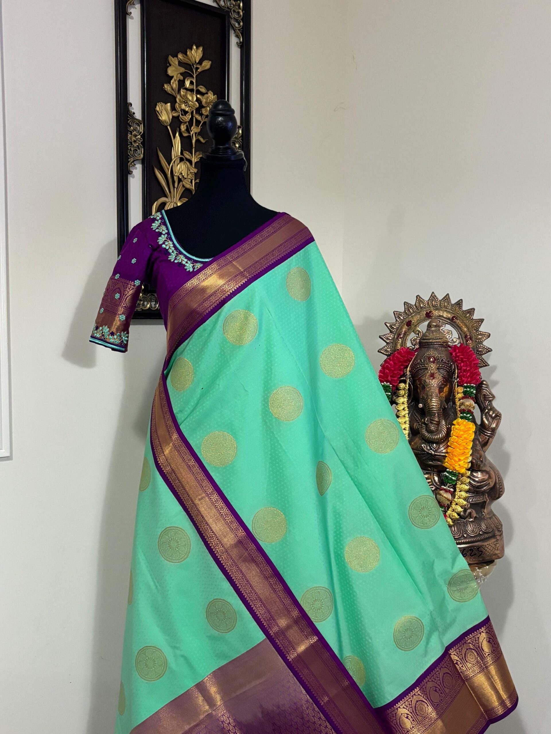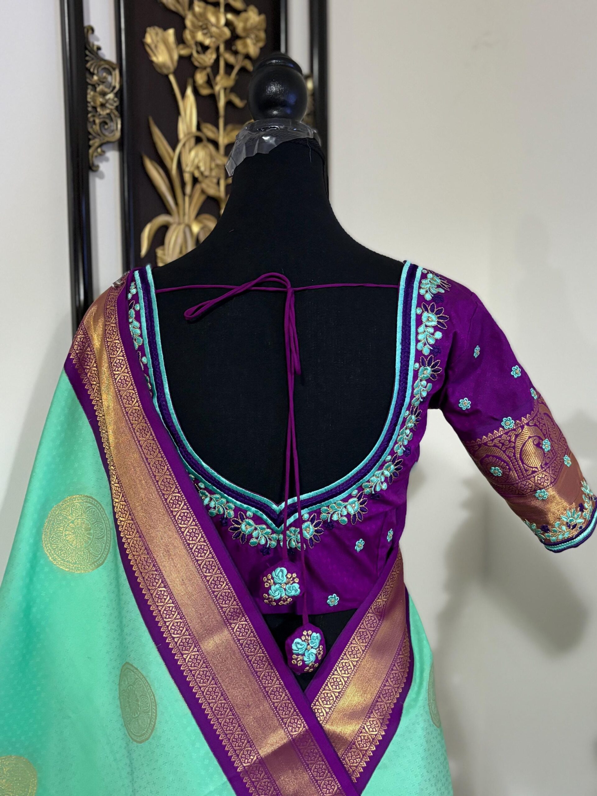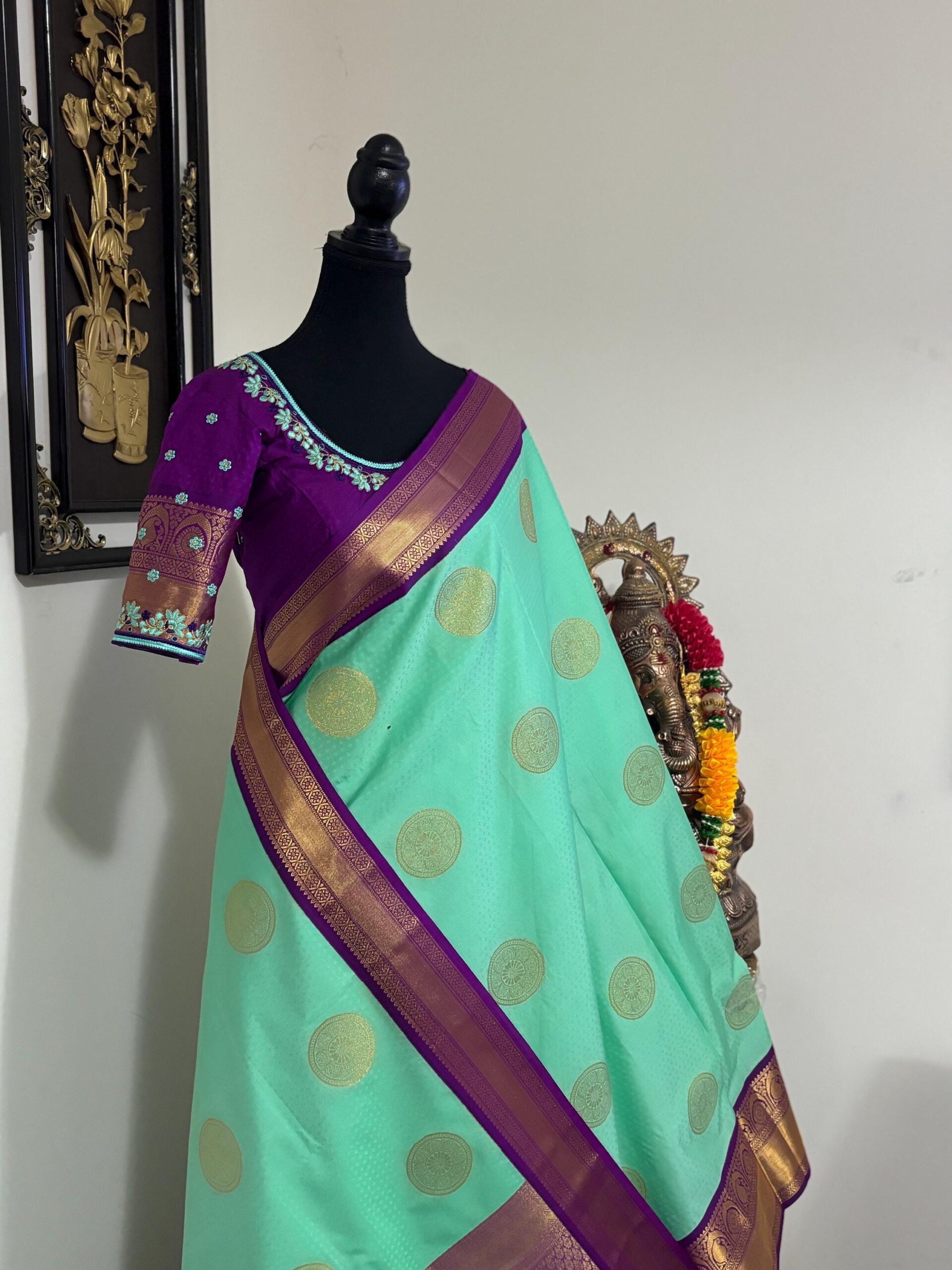 Kanjeevaram Kanchipuram soft silk saree in sea green rare colors with beautifully done handmade embroidered maggam blouse with ready to wear work blouse fits 32 to 46