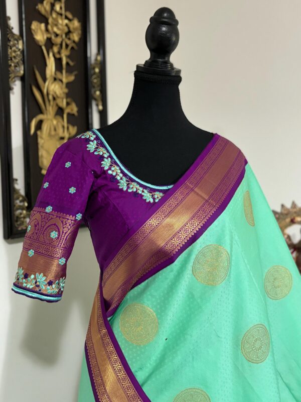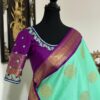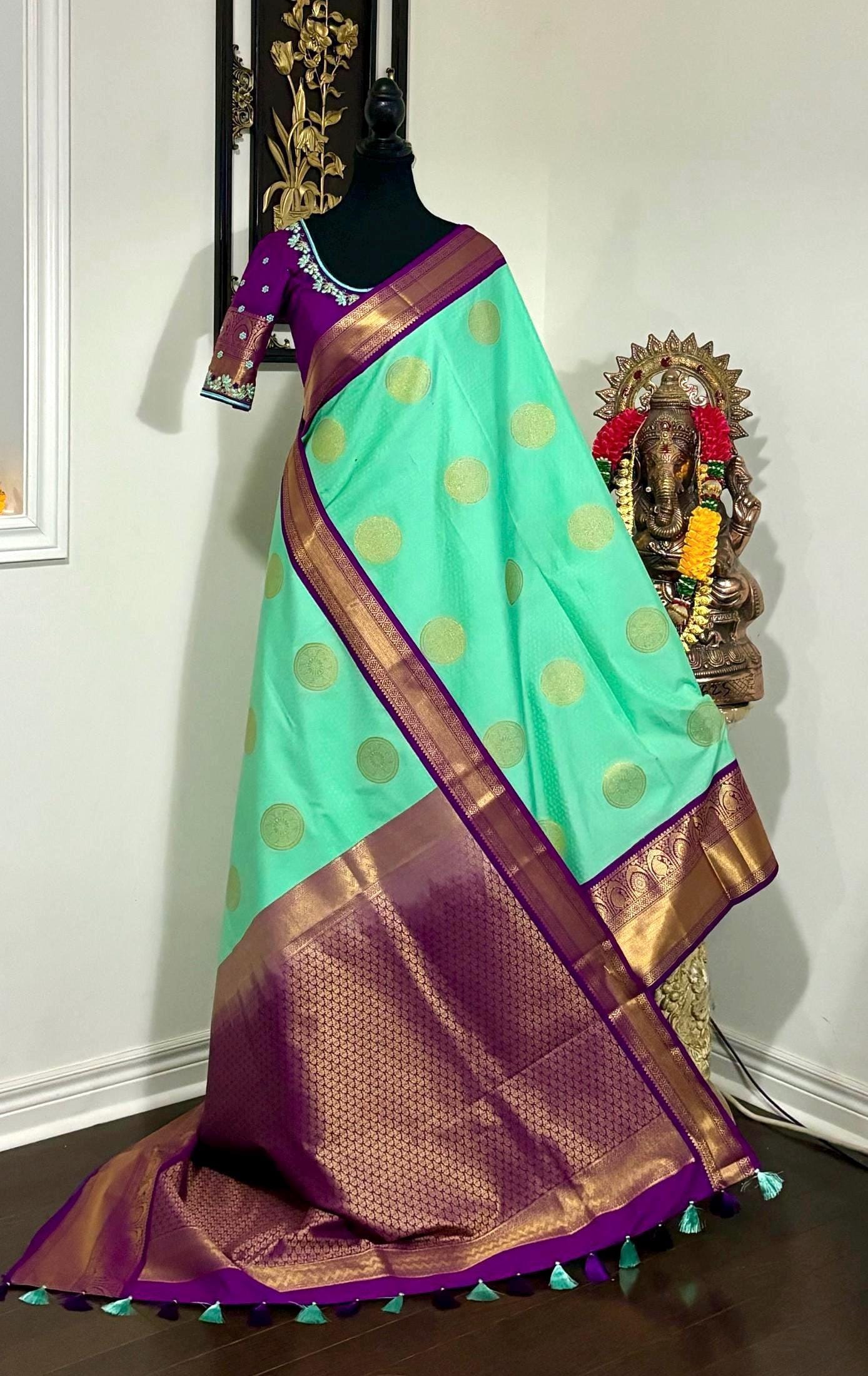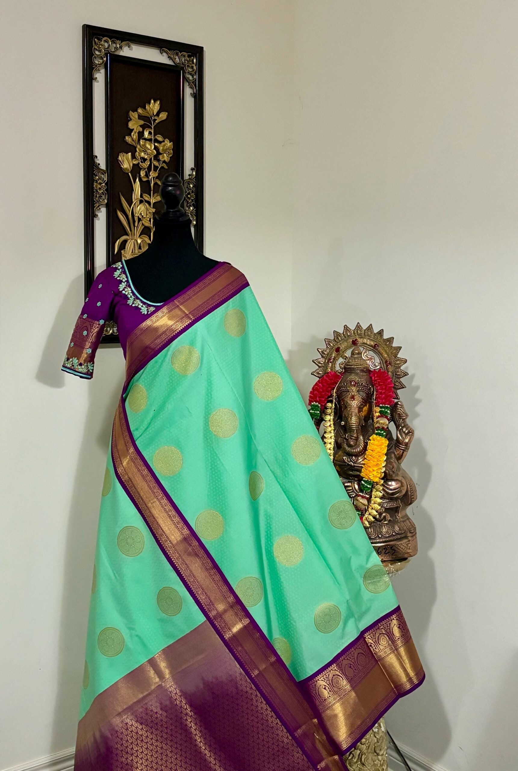 Kanjeevaram Kanchipuram soft silk saree in sea green rare colors with beautifully done handmade embroidered maggam blouse with ready to wear work blouse fits 32 to 46
