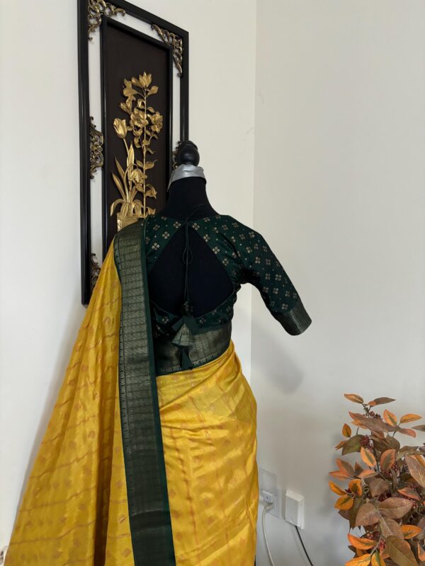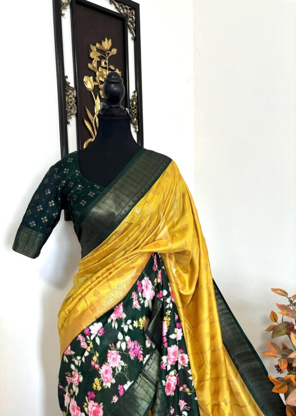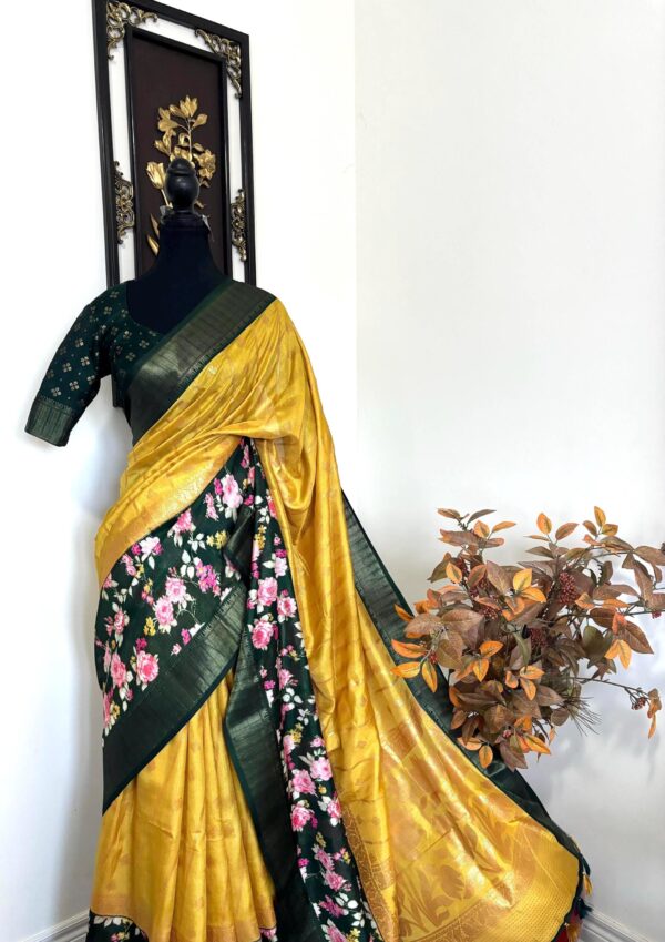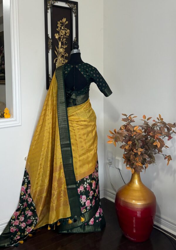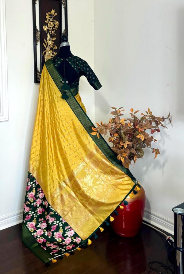 Light weight Yellow easy to drape Soft Silk fancy Saree; with beautiful floral design and design boarder ready to wear Blouse fits 32-46