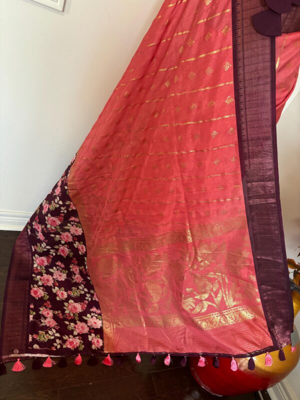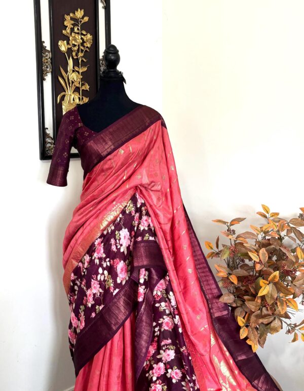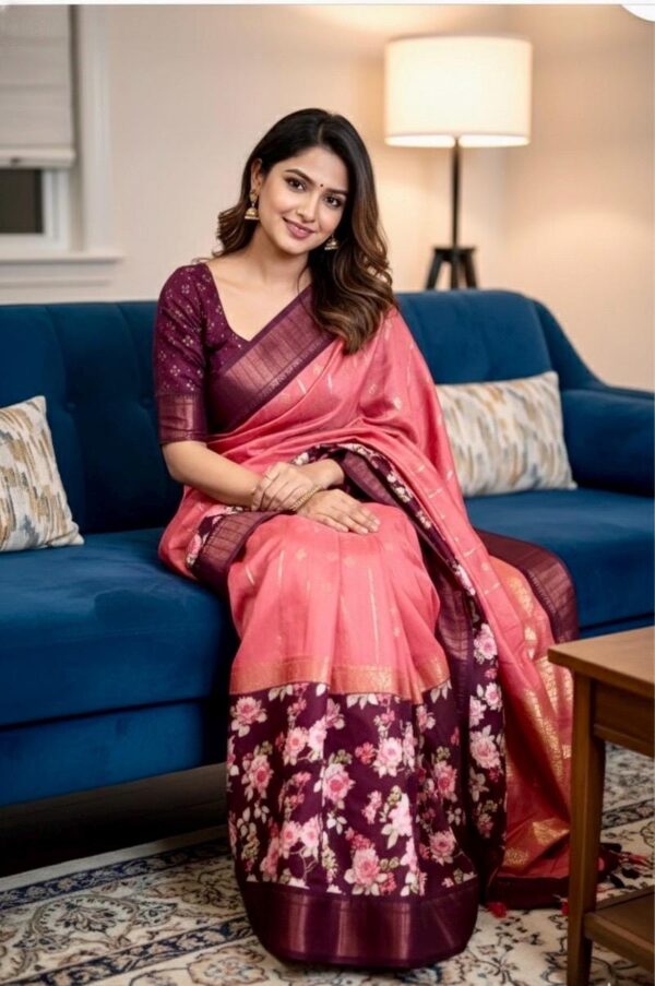 Light weight Maroon easy to drape Soft Silk fancy Saree; with beautiful floral design and design boarder ready to wear Blouse fits 32-46
