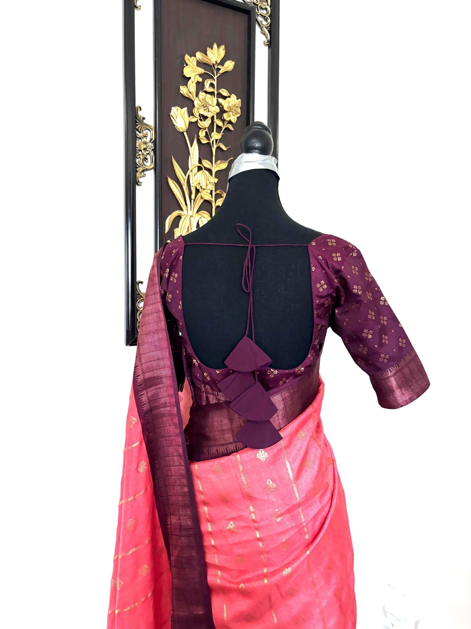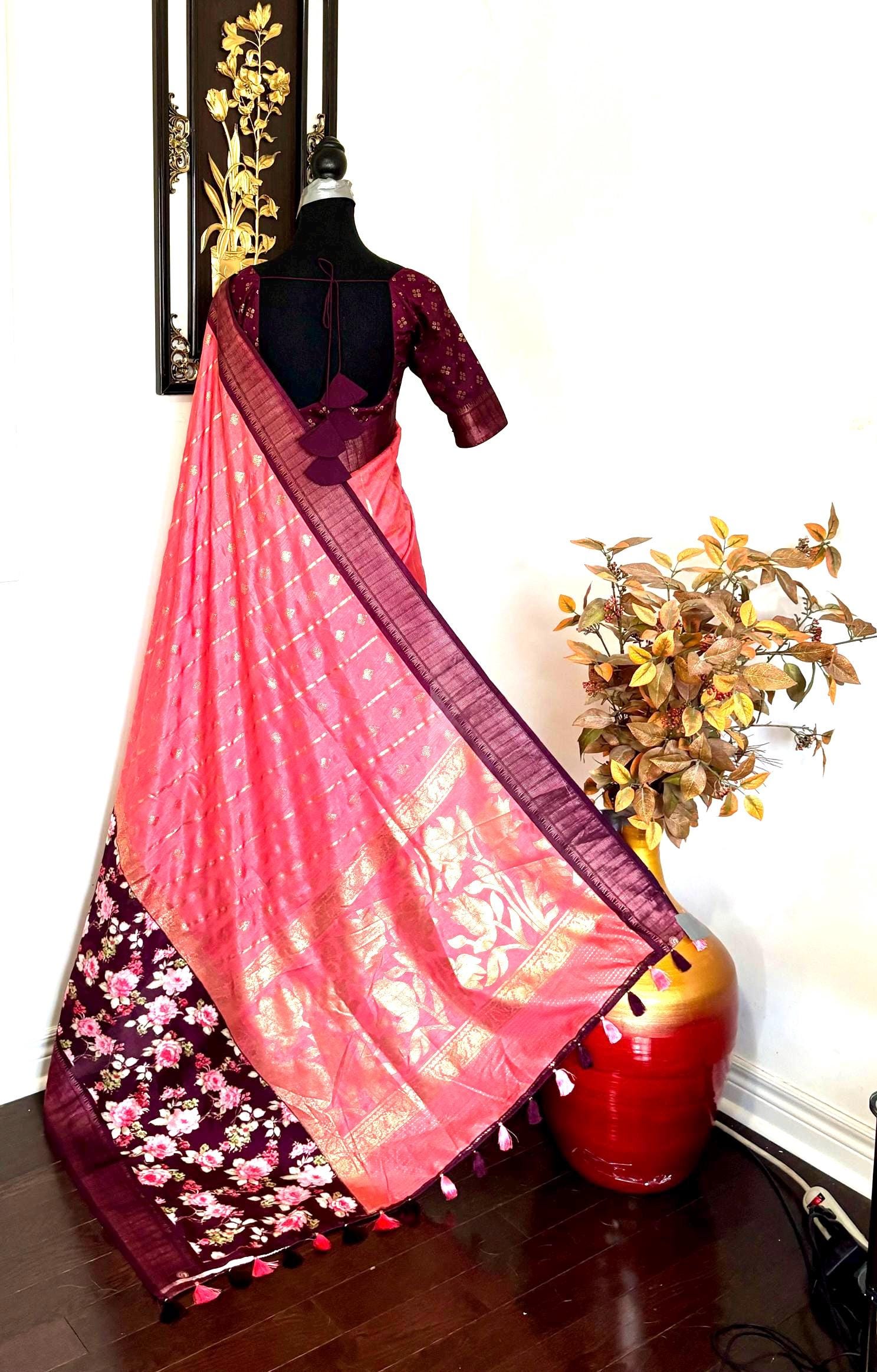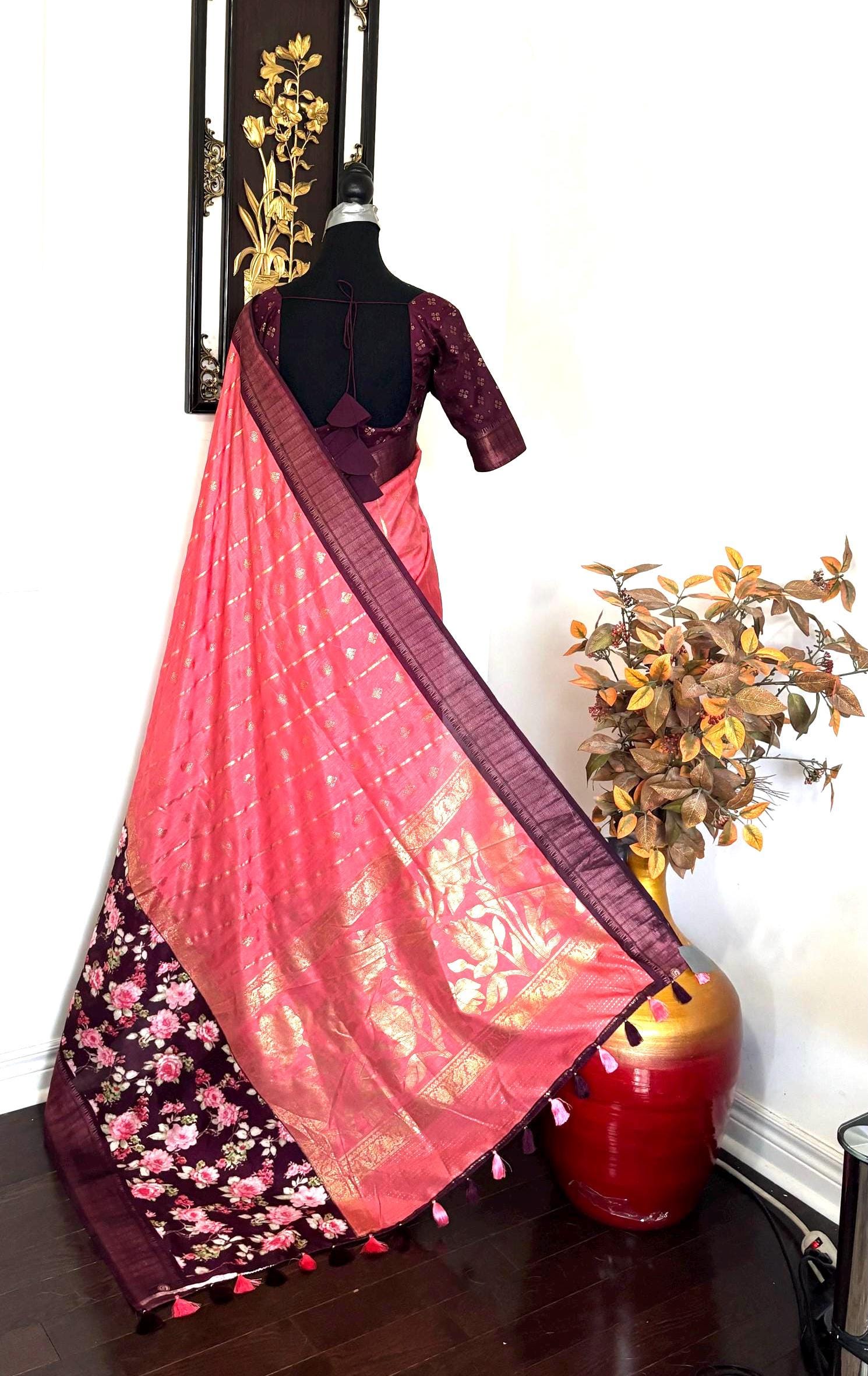Light weight Maroon easy to drape Soft Silk fancy Saree; with beautiful floral design and design boarder ready to wear Blouse fits 32-46