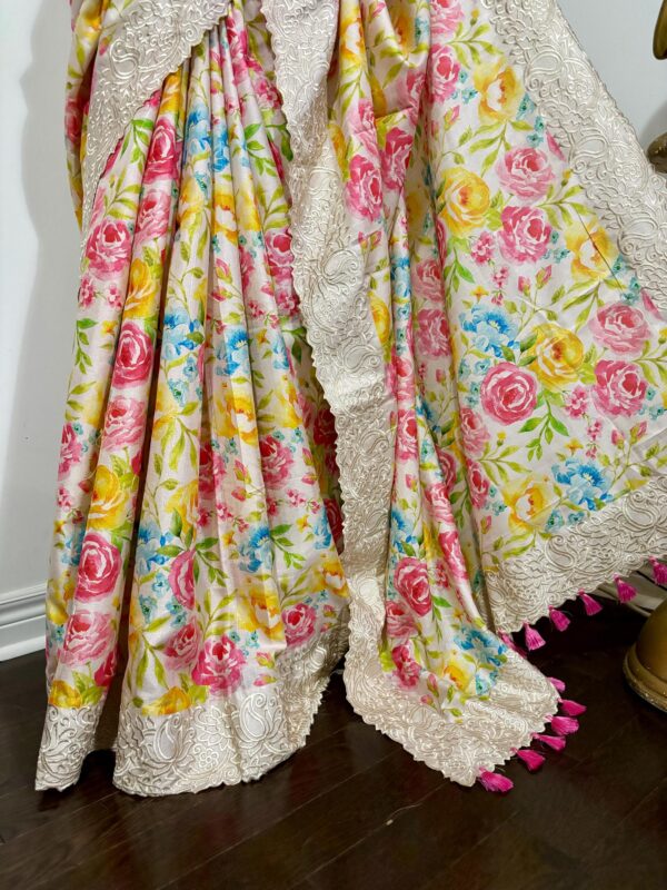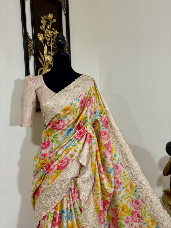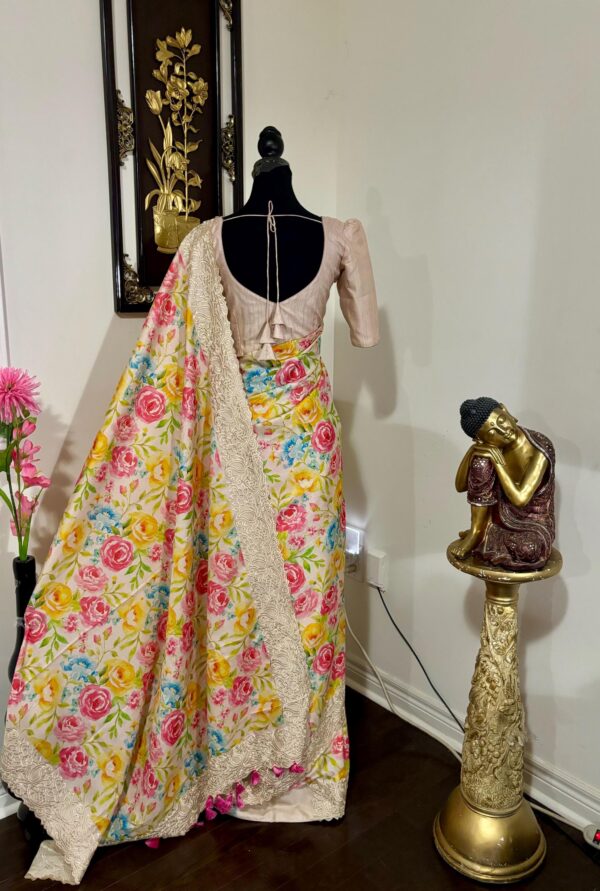 Light weight easy to drape Soft Silk fancy Saree; with beautiful floral design and design boarder ready to wear Blouse fits 32-46