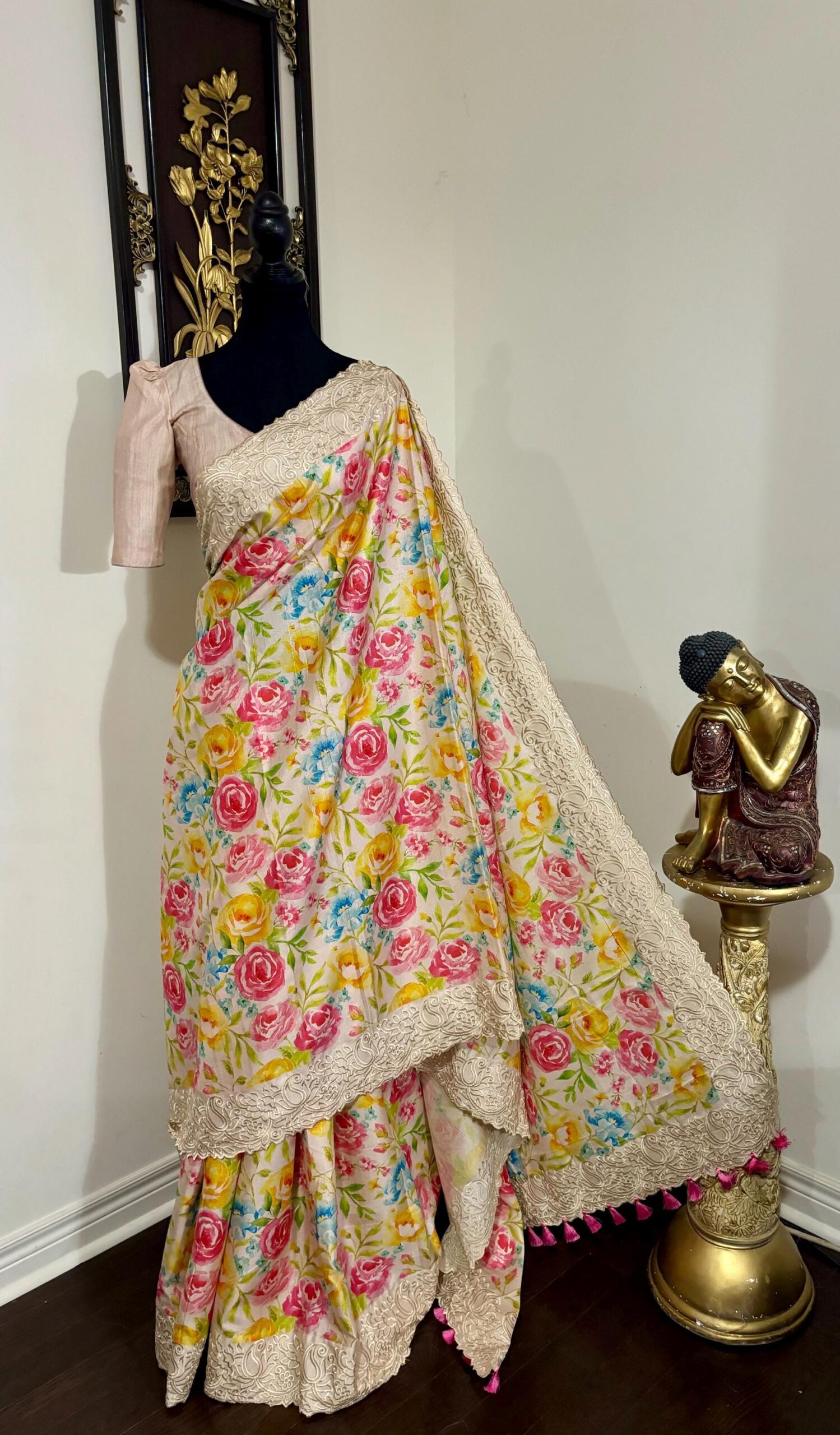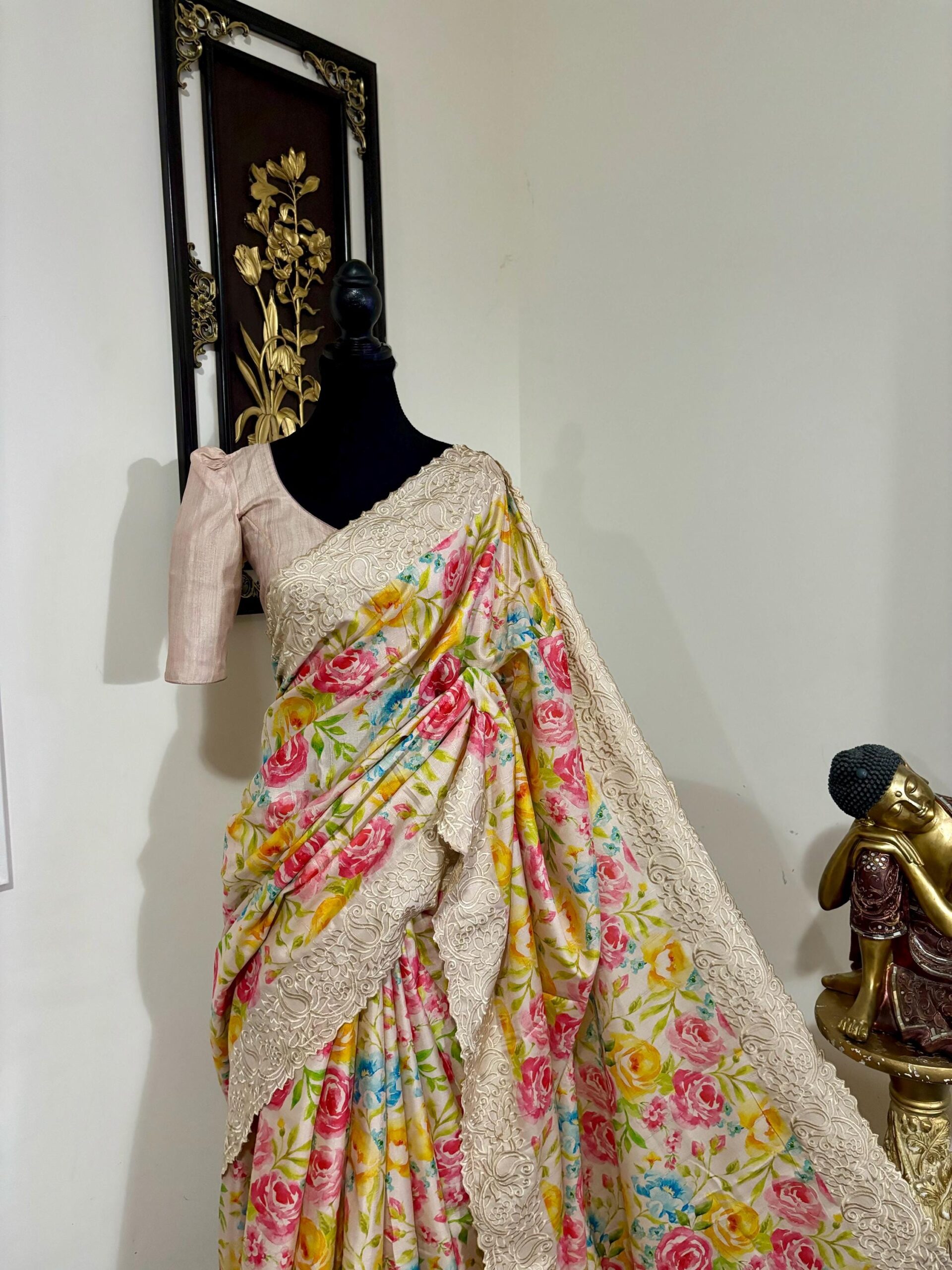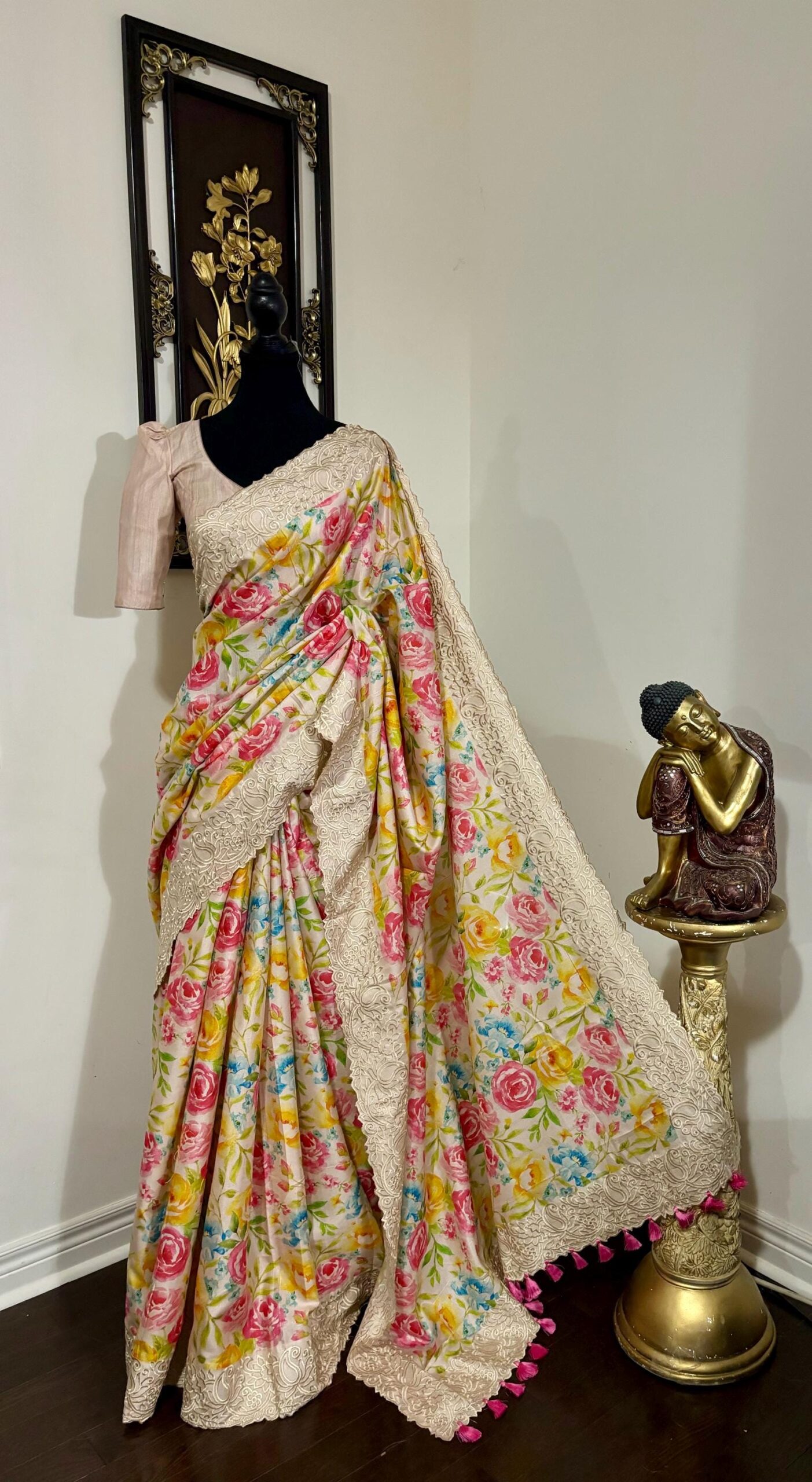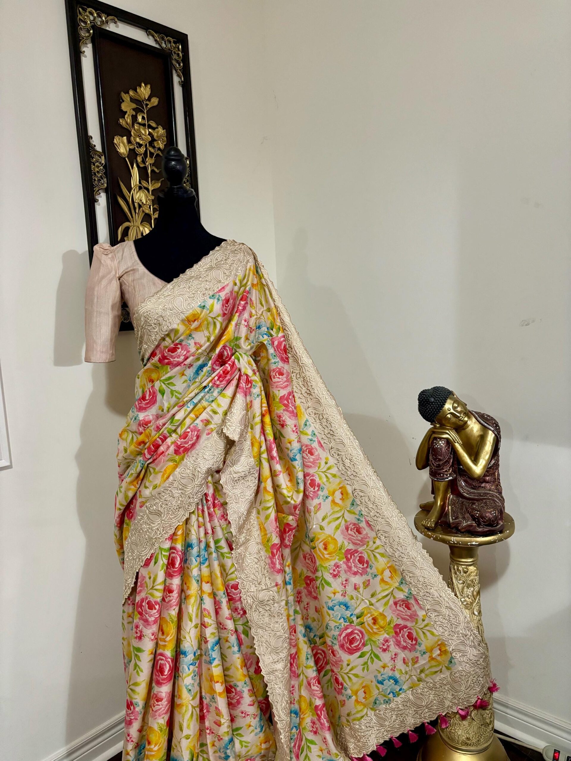 Light weight easy to drape Soft Silk fancy Saree; with beautiful floral design and design boarder ready to wear Blouse fits 32-46