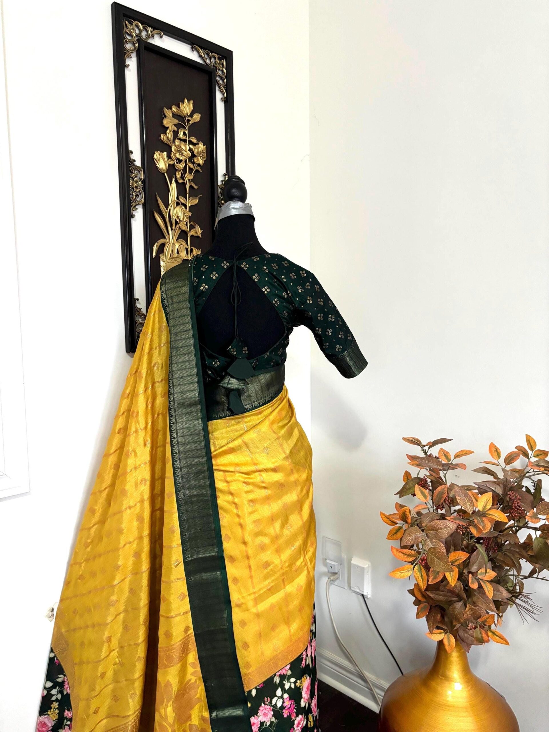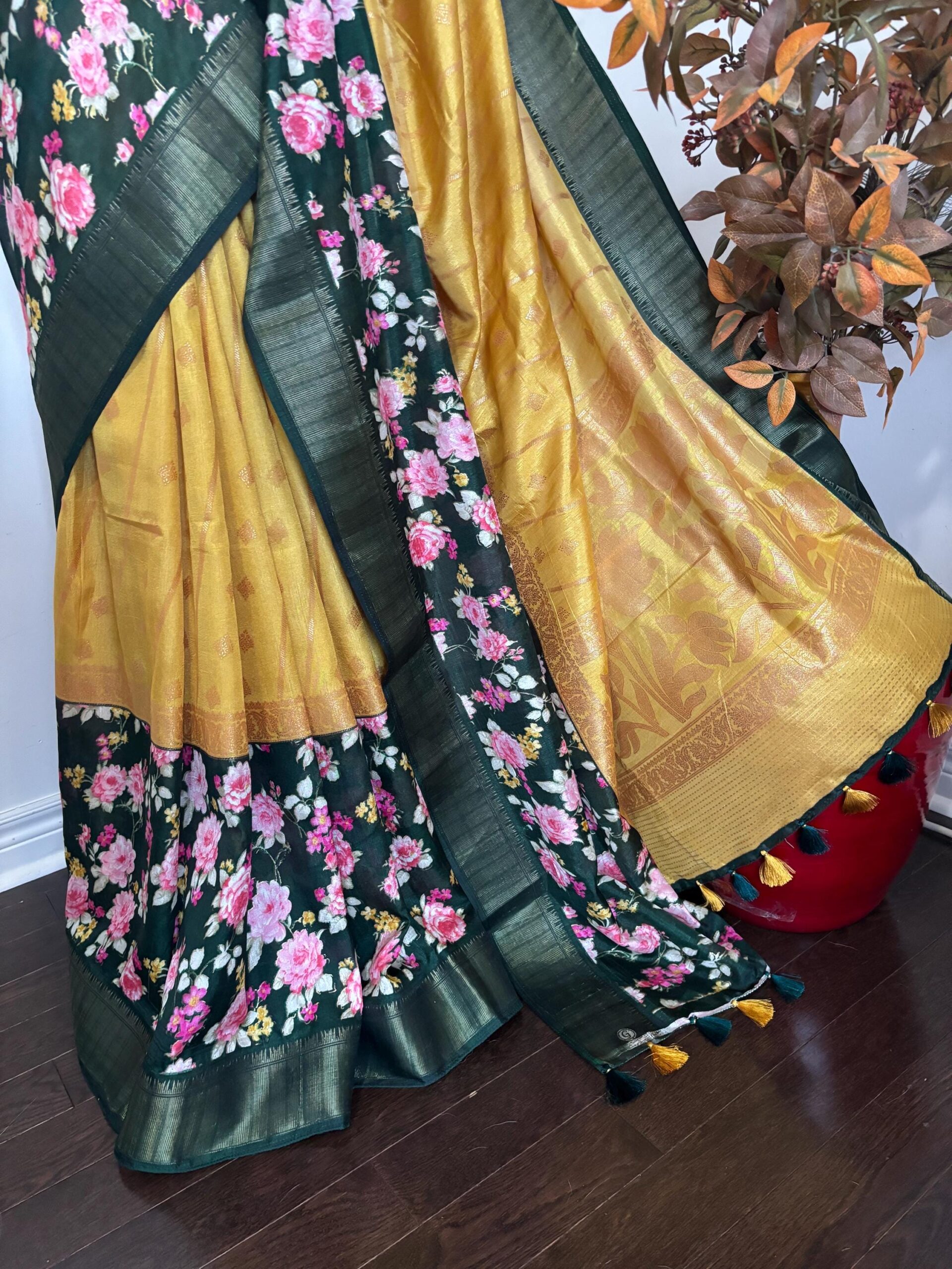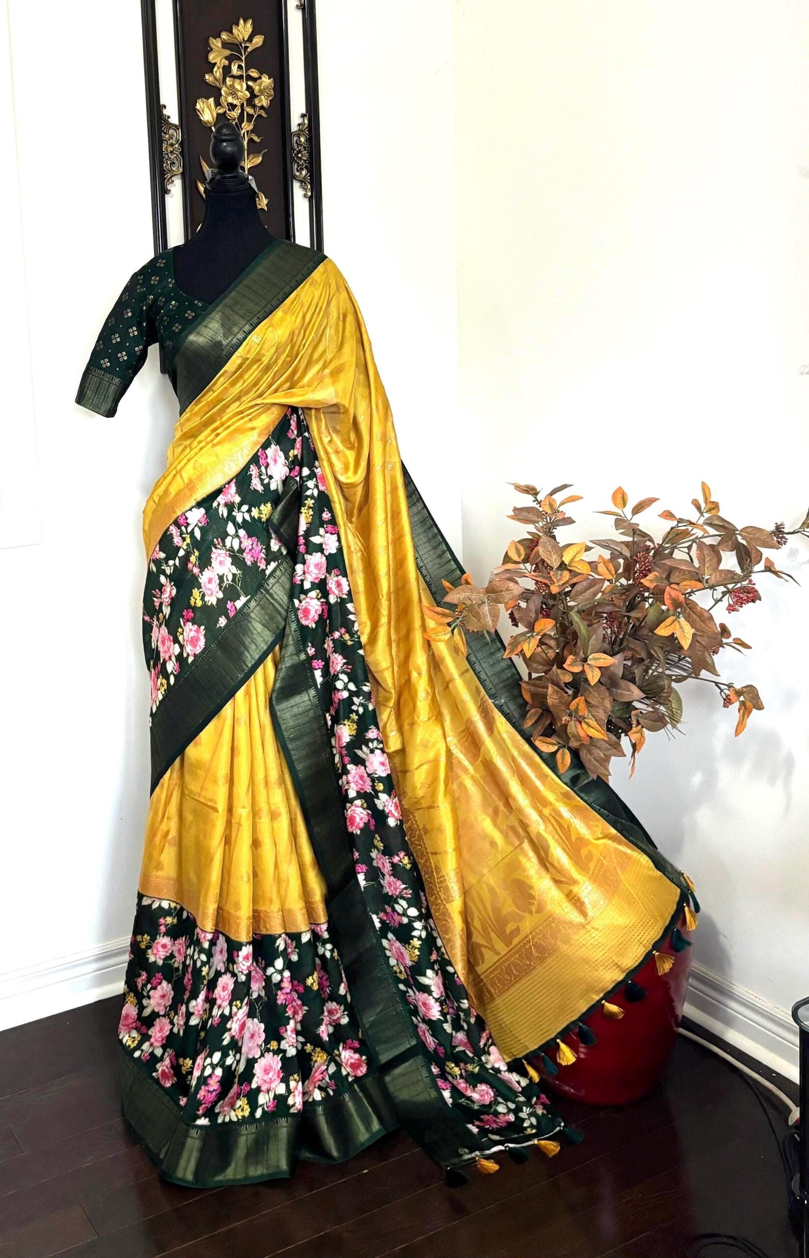 Light weight Yellow easy to drape Soft Silk fancy Saree; with beautiful floral design and design boarder ready to wear Blouse fits 32-46