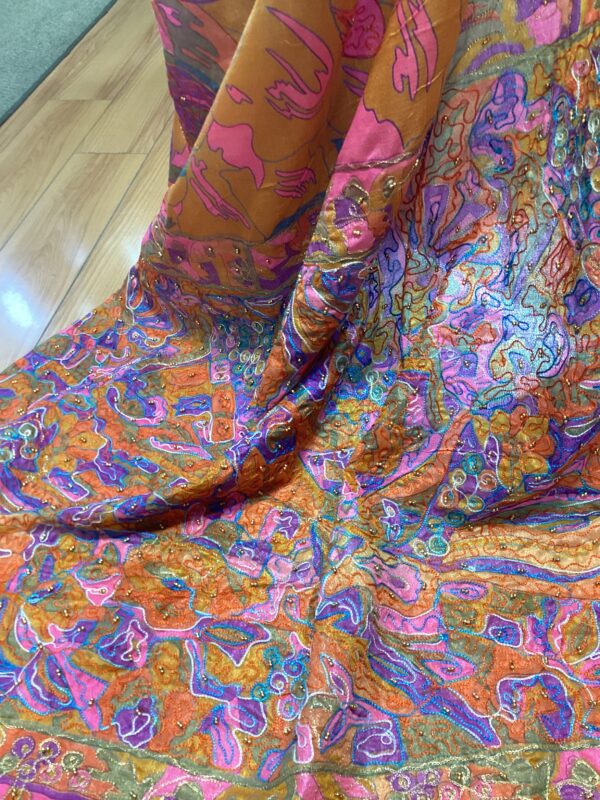 This exquisite saree showcases a stunning fusion of colors and contemporary artistry. Set on a warm mustard-orange base, it features an intricate abstract print in vibrant hues of pink, purple, and coral, creating a captivating visual flow with matching blouse piece . Crafted from soft, fluid fabric, the saree drapes effortlessly, accentuating the silhouette with elegance. The rich mix of tones and patterns gives it a luxurious, designer-inspired appeal — perfect for cocktail evenings, art-inspired events, or festive gatherings where you want to make a bold yet graceful statement.