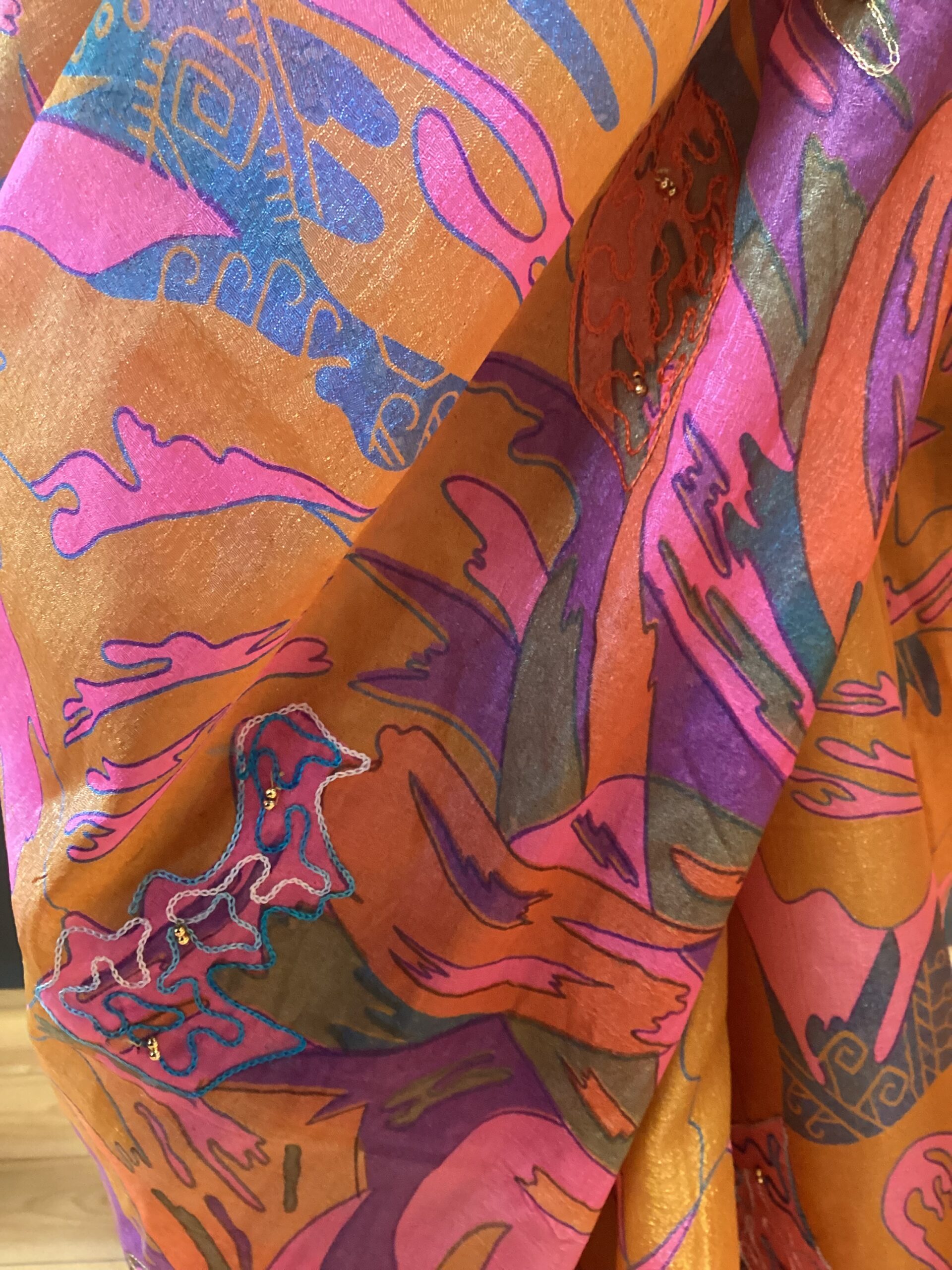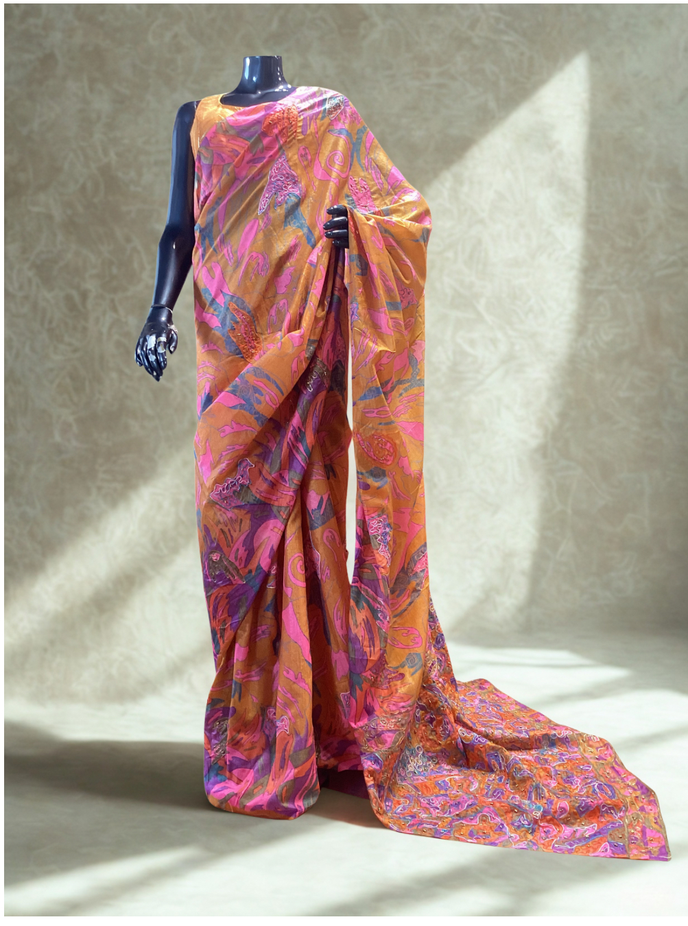 This exquisite saree showcases a stunning fusion of colors and contemporary artistry. Set on a warm mustard-orange base, it features an intricate abstract print in vibrant hues of pink, purple, and coral, creating a captivating visual flow with matching blouse piece . Crafted from soft, fluid fabric, the saree drapes effortlessly, accentuating the silhouette with elegance. The rich mix of tones and patterns gives it a luxurious, designer-inspired appeal — perfect for cocktail evenings, art-inspired events, or festive gatherings where you want to make a bold yet graceful statement.