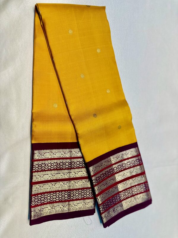 Colour: Mustard Yellow Maroon Crimson or Wine Red Contrast Border and Pallu with Gold Zari work