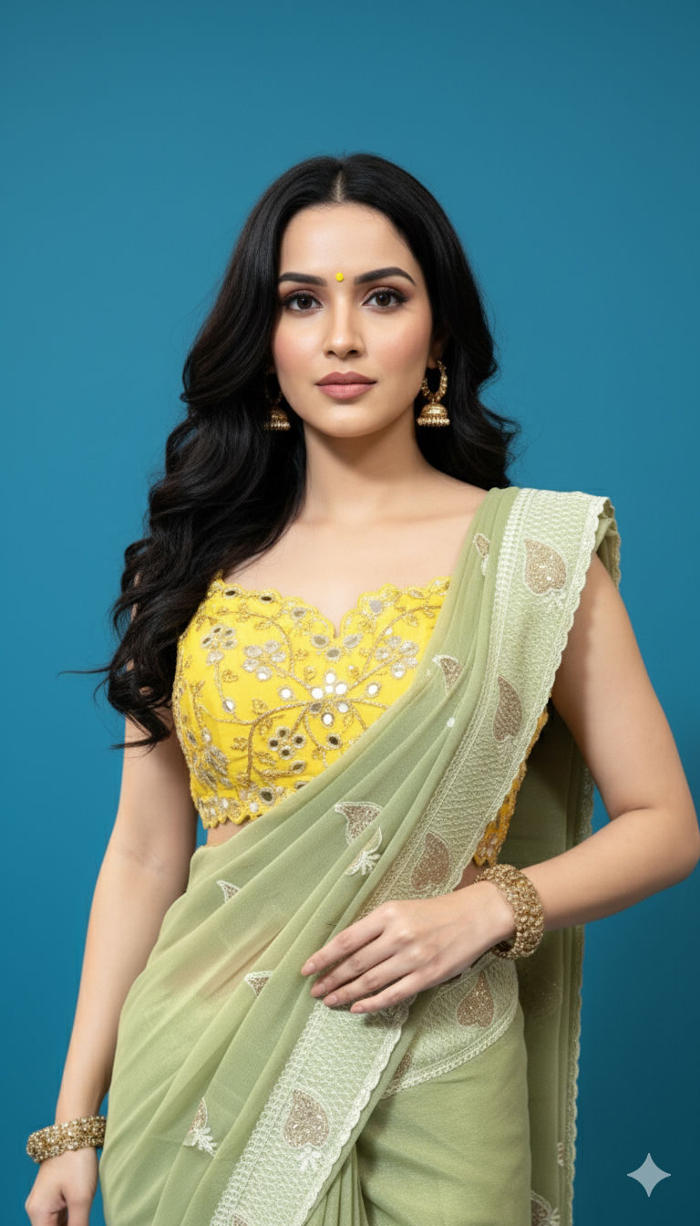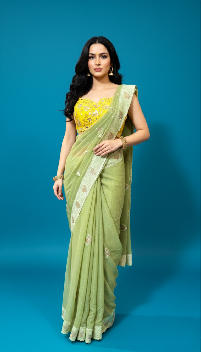 This sea green Party Saree is soft, trendy and elegant. suitable for a casual or special evening. blouse material attached. couple with our contrast mirror blouse if you want to lift your look in luxury