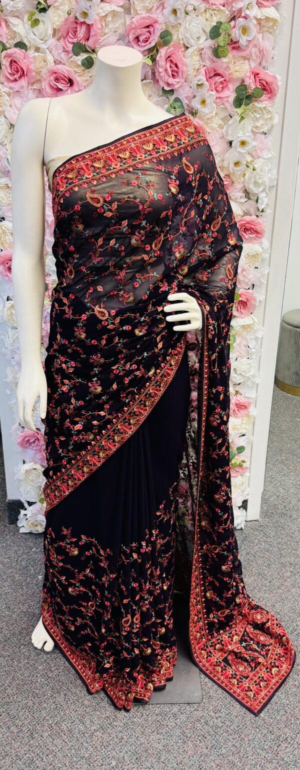 Experience the opulence of Kashmir with this exquisitely crafted Navy Blue Kashmiri Saree. Handwoven by skilled artisans, the saree features intricate Pashmina embroidery on the borders, with delicate floral patterns that capture the essence of Kashmiri craftsmanship. The rich navy blue shade adds a timeless touch to this traditional garment, making it perfect for weddings, festive occasions, or special events.