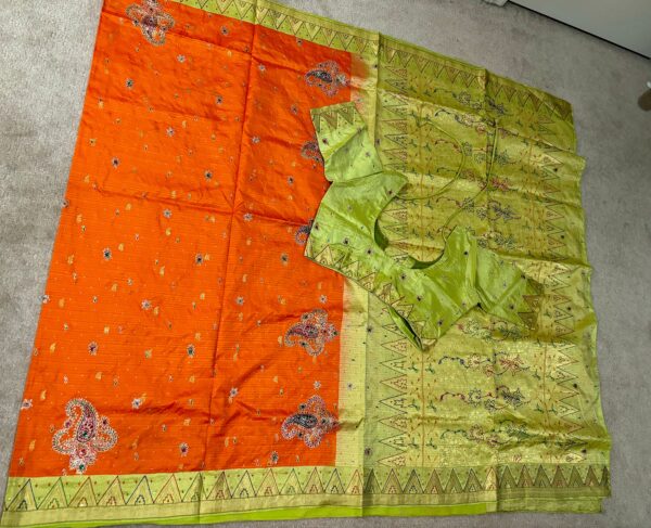 Unique color combinations! Pure Banarasi Pattu saree with all over embroidery work weaving on all over the saree!