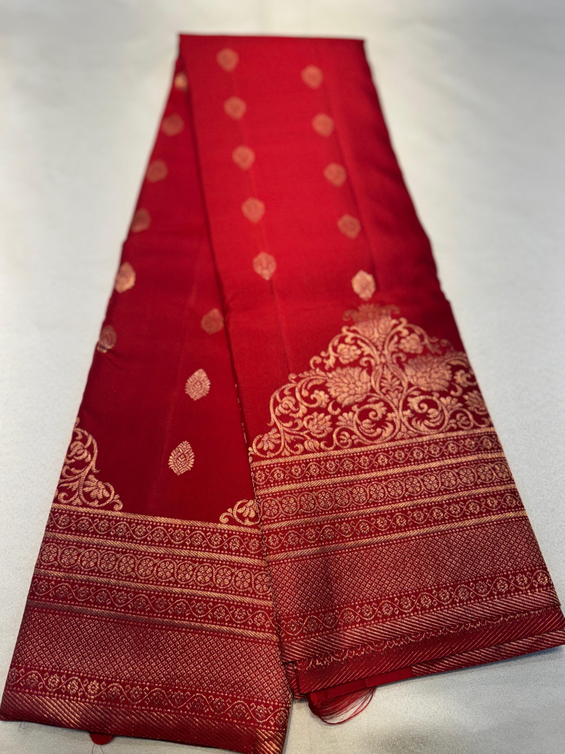 This exquisite pure Red Kanjipuram saree is a timeless masterpiece woven from the finest silk threads in the temple town of Kanchipuram, Tamil Nadu. Known for its luxurious texture and durability, this saree showcases intricate zari work and traditional motifs inspired by South Indian culture. The contrasting border and pallu add a regal touch, making it ideal for weddings, celebrations, and special occasions. A symbol of elegance and heritage, this saree is a must-have in every traditional wardrobe.