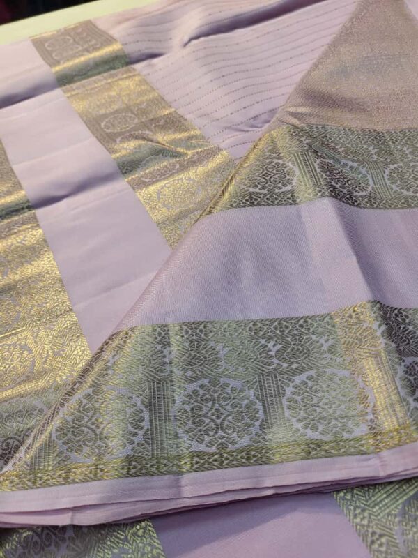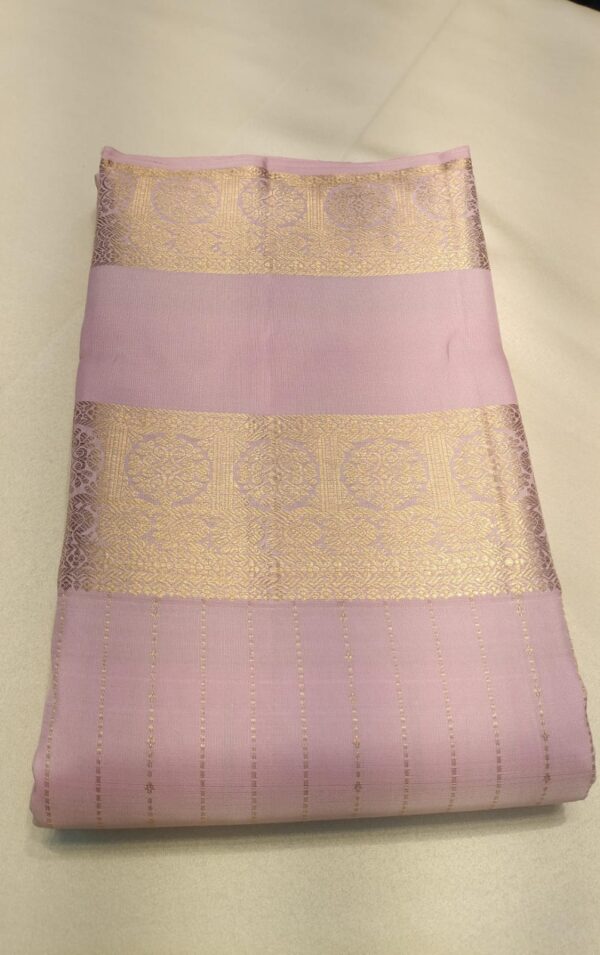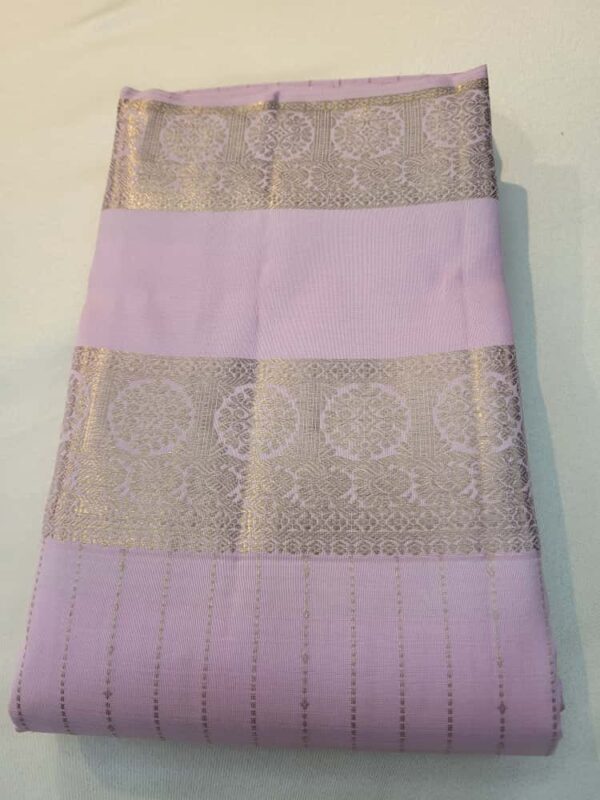 This pastel pink pure Kanjipuram silk saree is the epitome of elegance and subtle charm. Woven with the finest silk, it showcases delicate golden zari work along the borders and pallu, adorned with intricate floral patterns and vertical stripes. The soft hue combined with rich traditional craftsmanship makes it perfect for weddings, festive occasions, or graceful evening wear. A beautiful blend of sophistication and tradition, this saree is a must-have for every saree lover’s collection.
