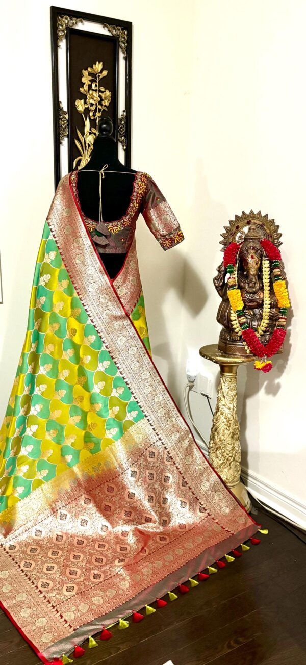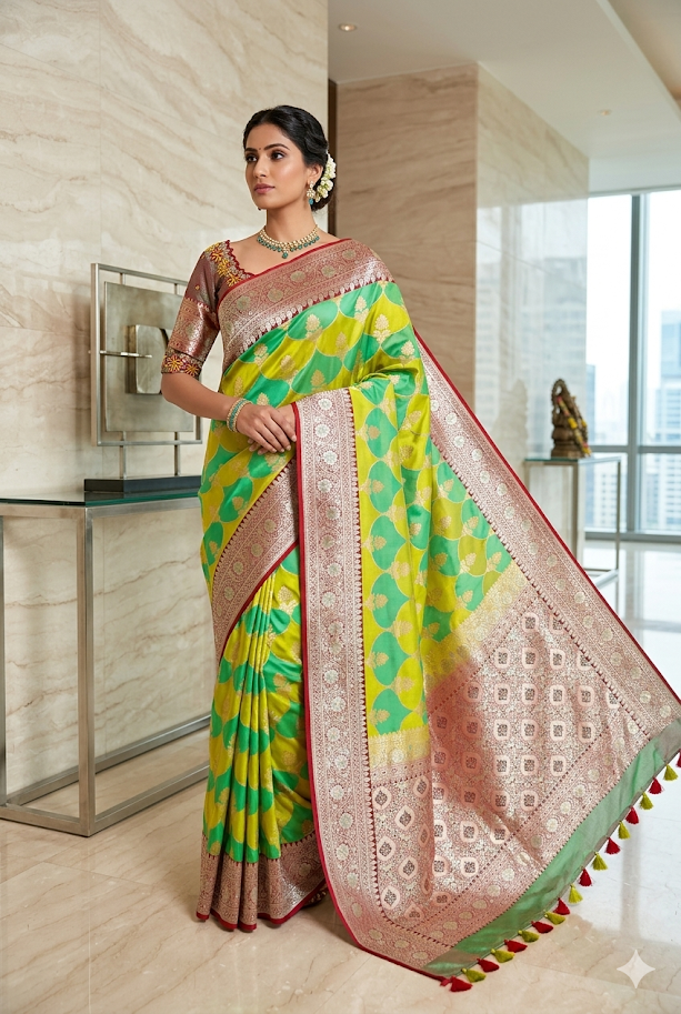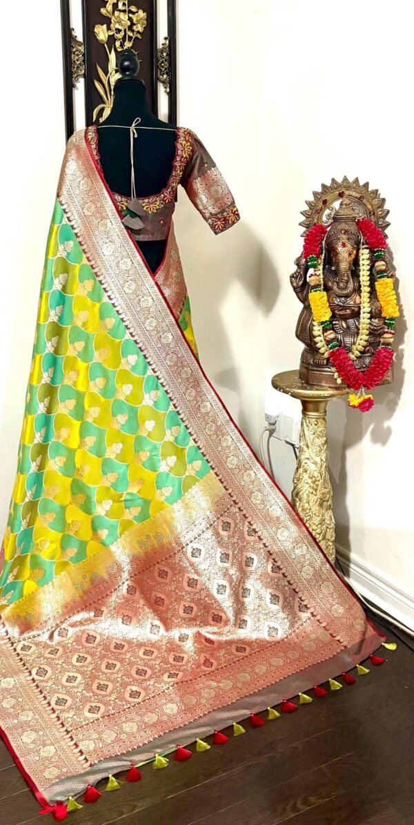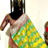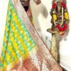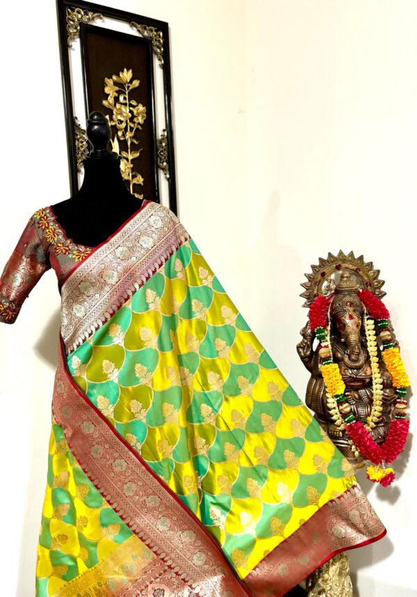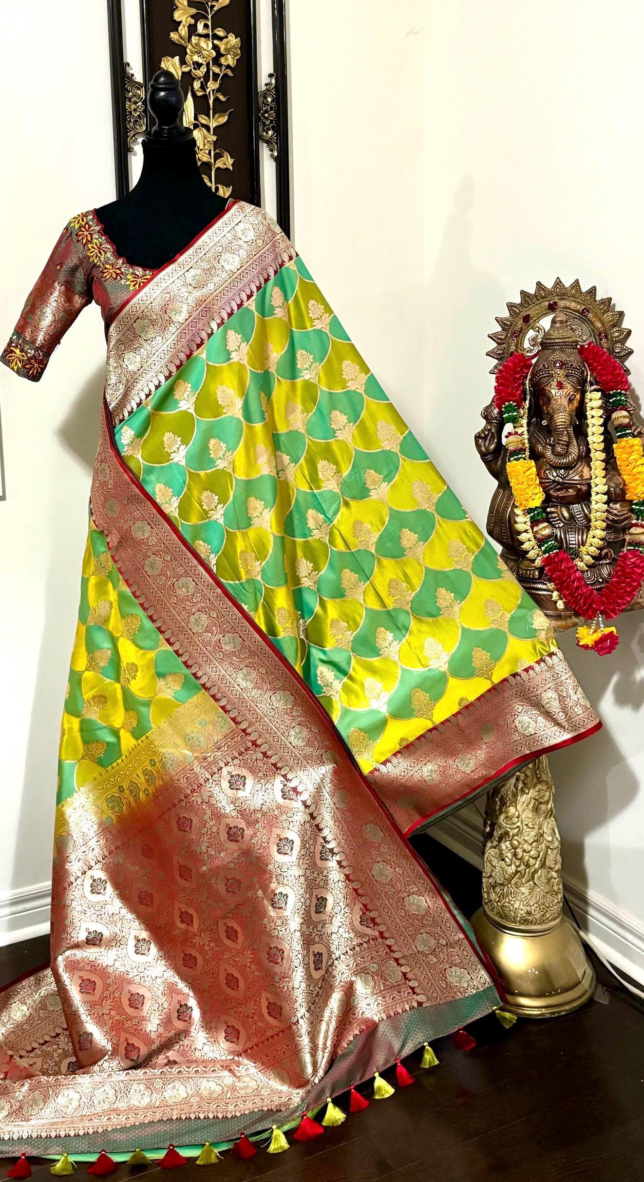 Beautiful Bridal pure silk banarasi silk saree in Light green and YellowĀ Ā paired up with beautiful embroidery blouse fits to 32 to 46 in beautiful rare colors all over the saree jaal