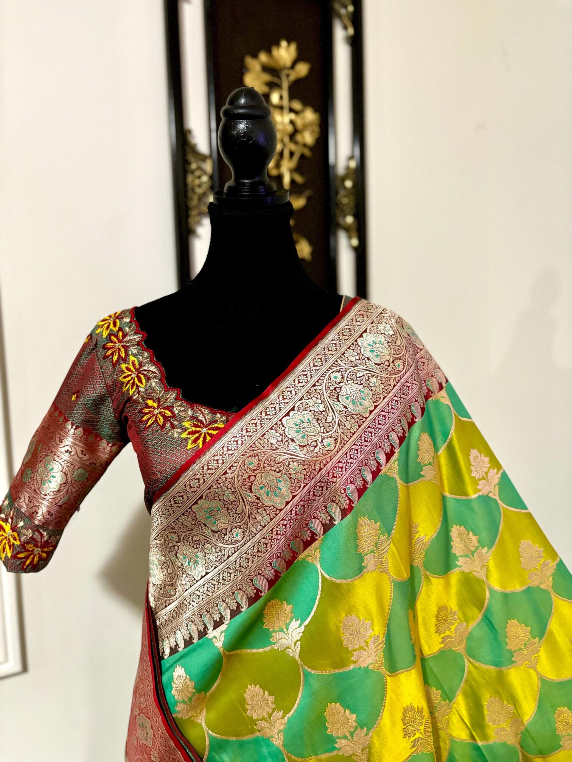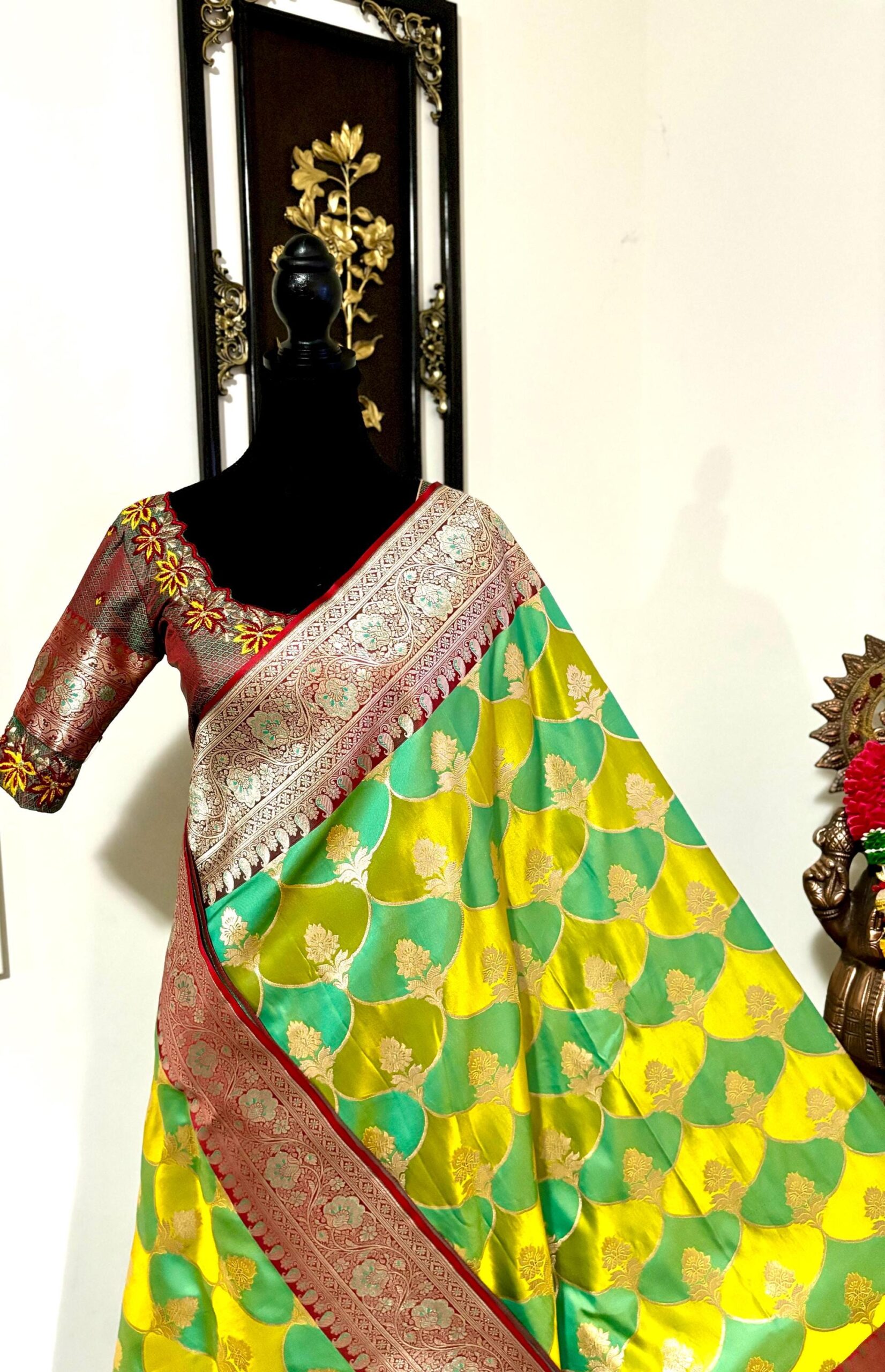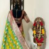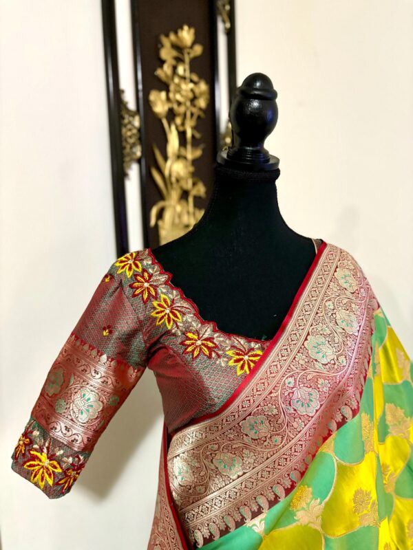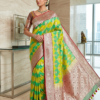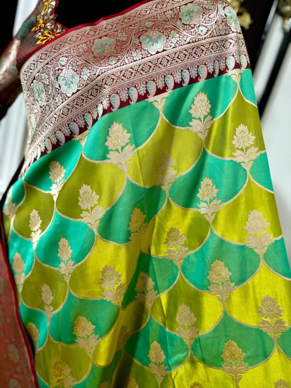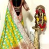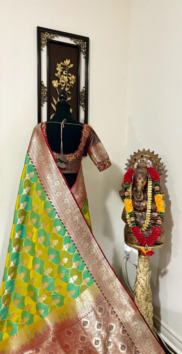 Beautiful Bridal pure silk banarasi silk saree in Light green and YellowĀ Ā paired up with beautiful embroidery blouse fits to 32 to 46 in beautiful rare colors all over the saree jaal