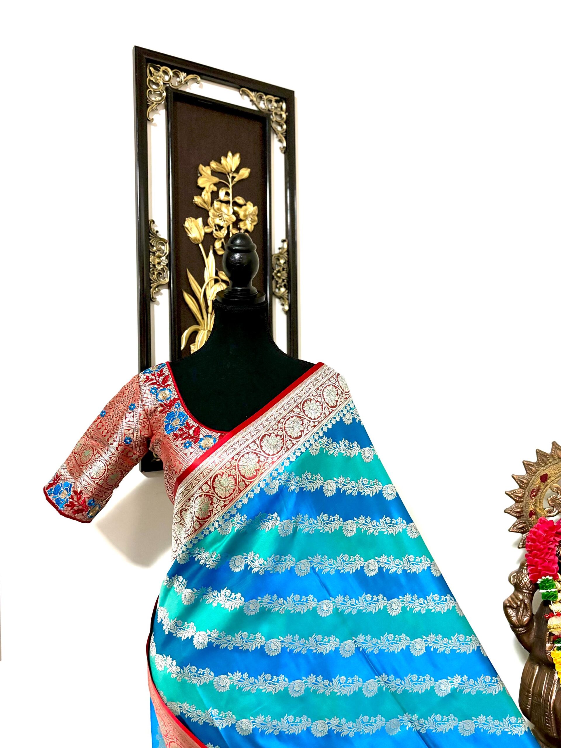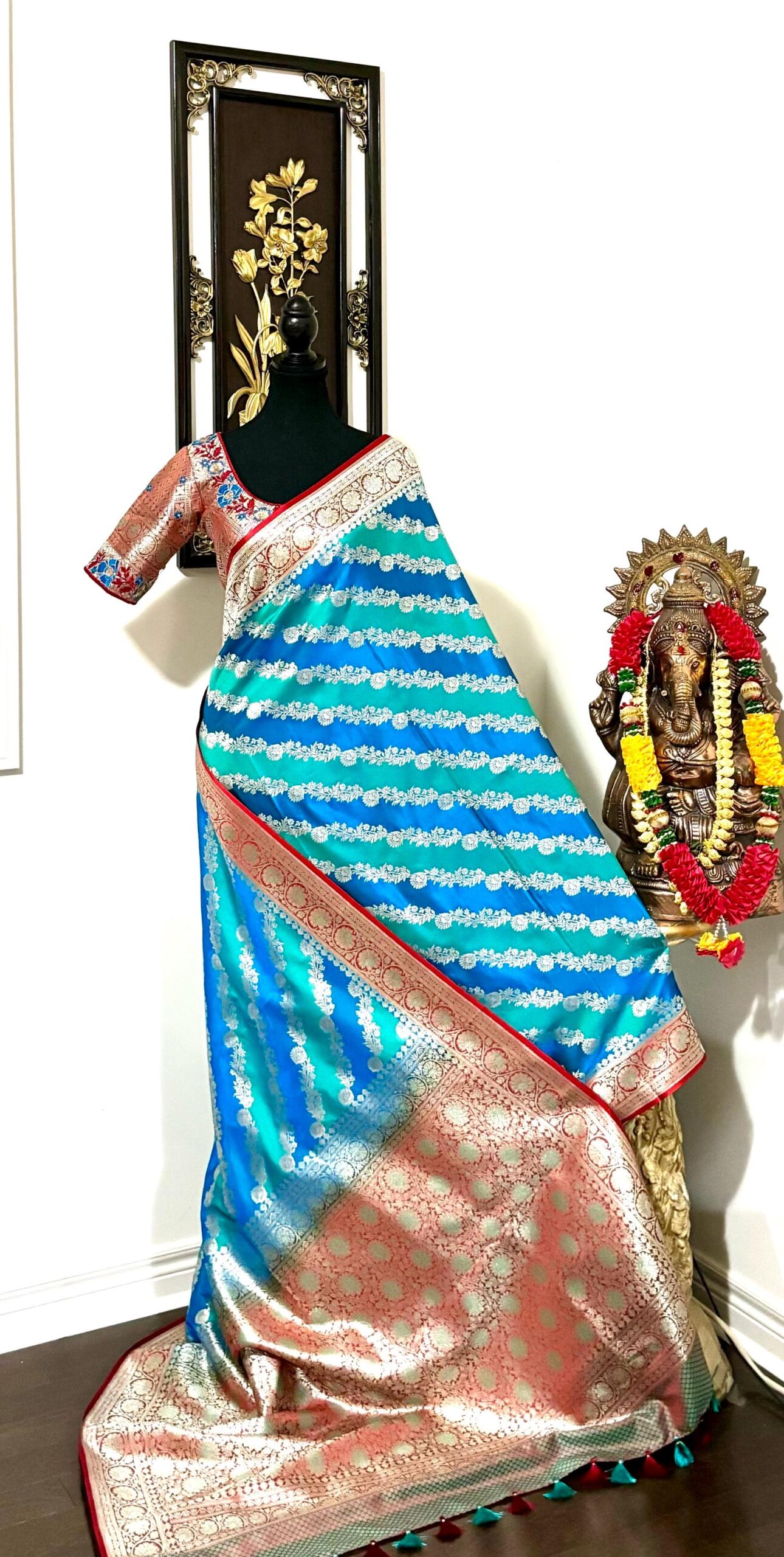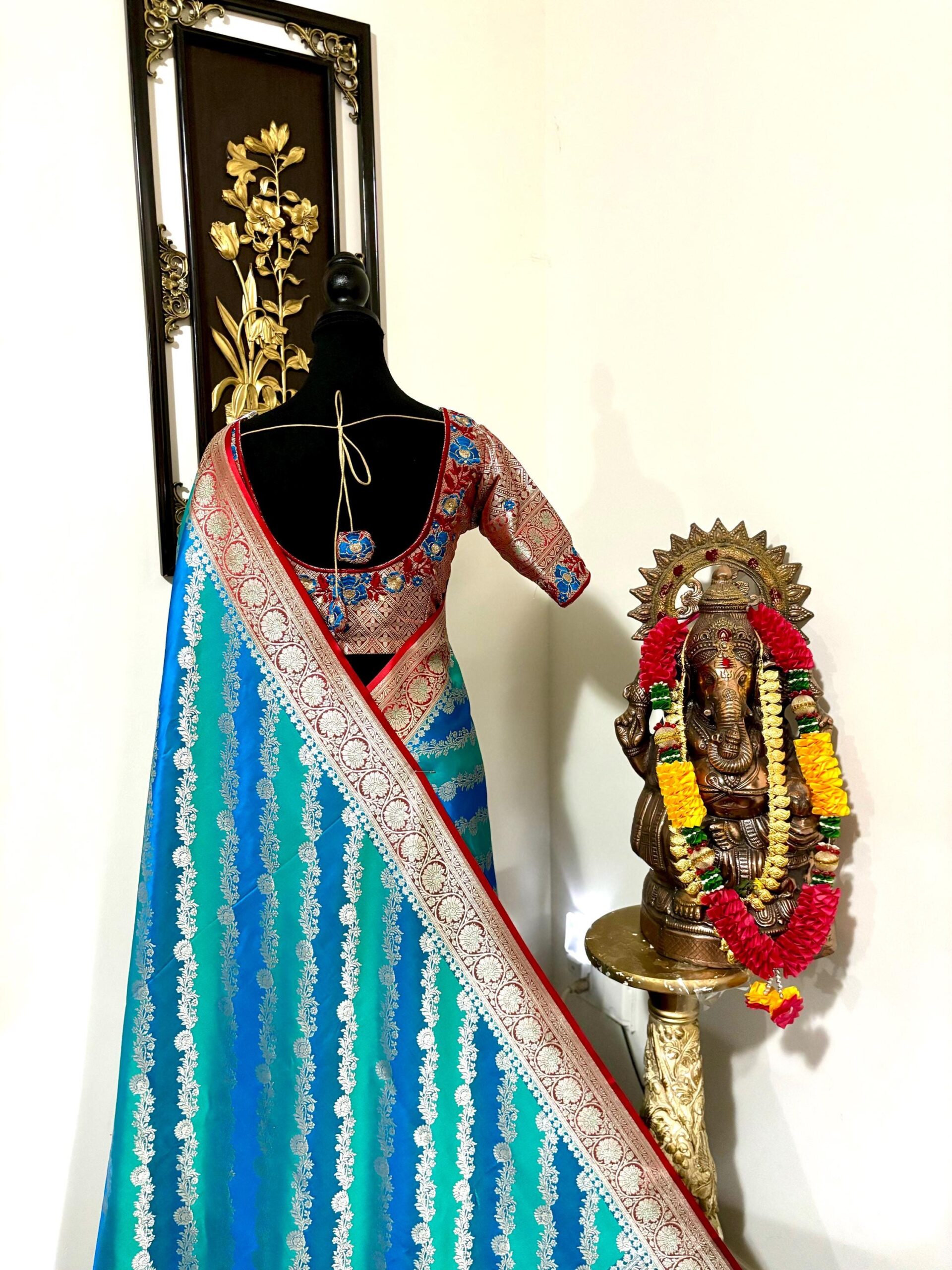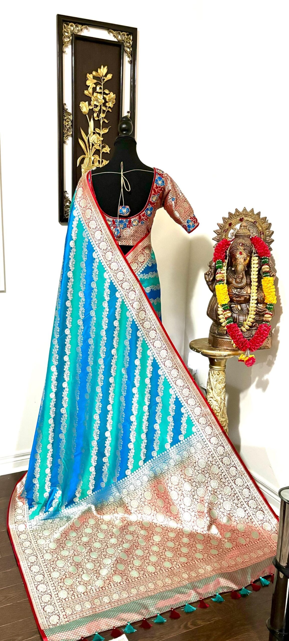 Beautiful Bridal pure silk banarasi silk saree paired up with beautiful embroidery blouse fits to 32 to 46 in beautiful rare colors all over the saree jaal