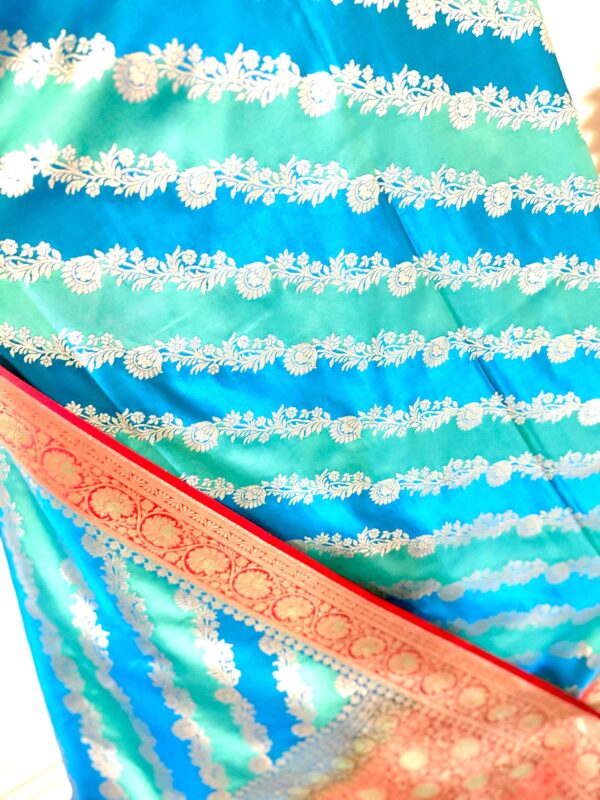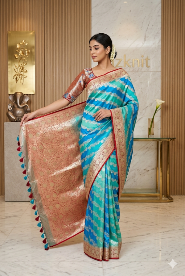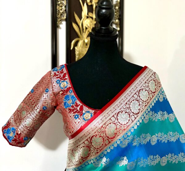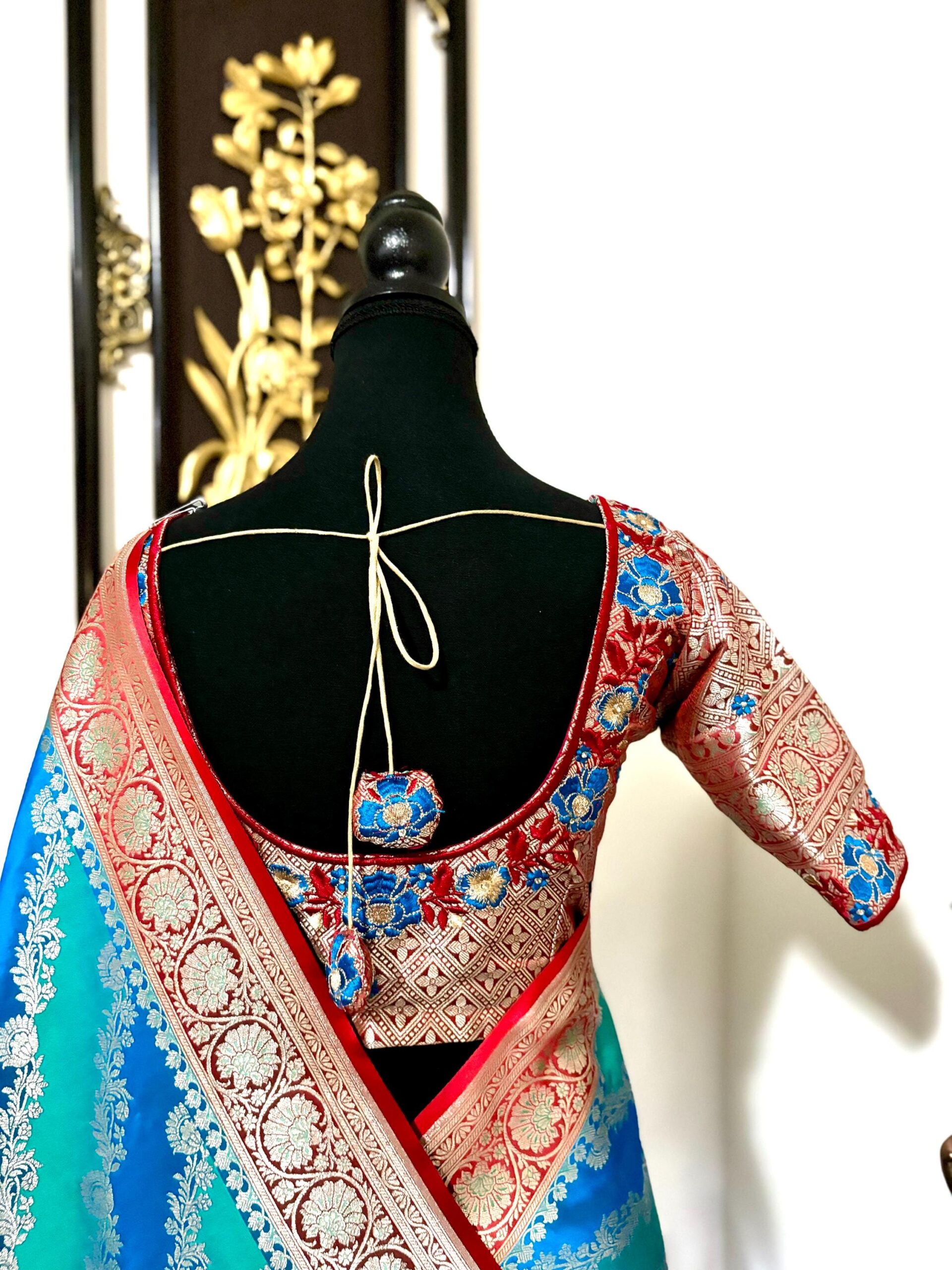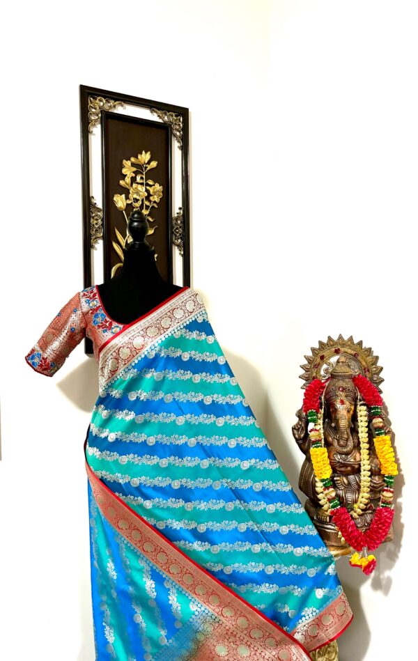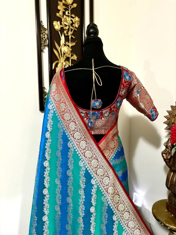 Beautiful Bridal pure silk banarasi silk saree paired up with beautiful embroidery blouse fits to 32 to 46 in beautiful rare colors all over the saree jaal