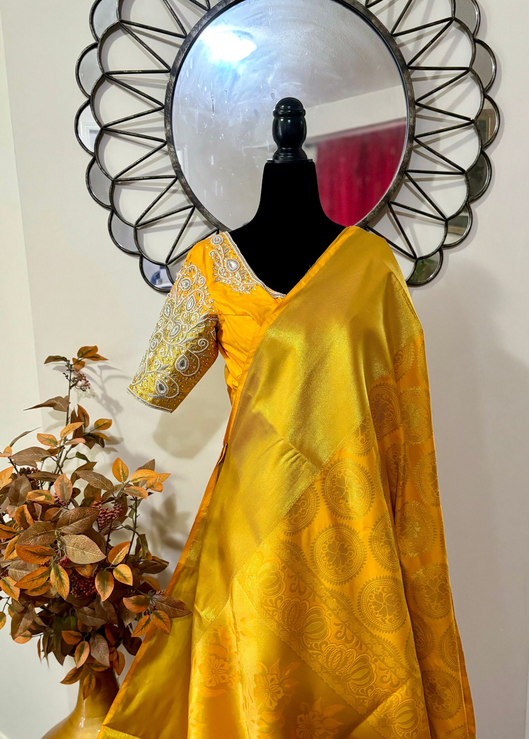 Pure Silk Kanjeevaram/Kanchipattu Sarees with ready to wear maggam blouse 32-42. Saree is ready fall and pico ideal for parties and festivals