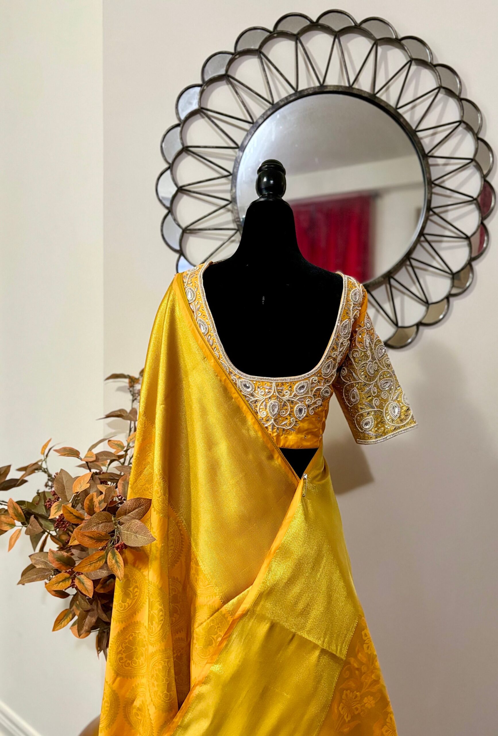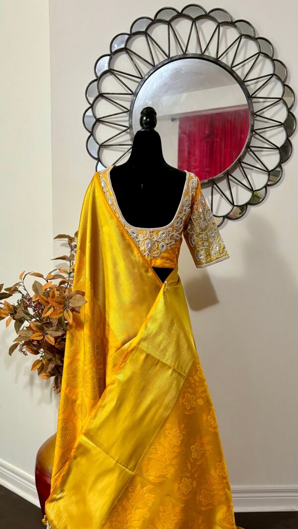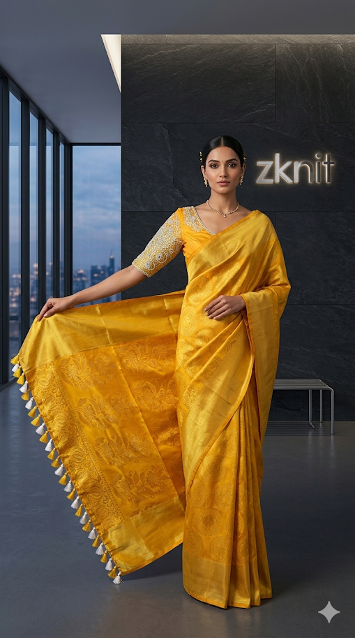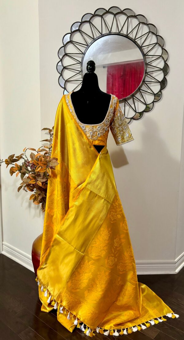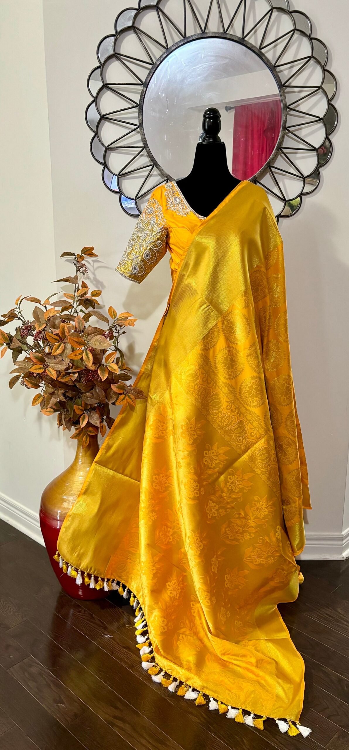 saree is beautiful mustard yellow color saree is ready with beautiful fancy tussels make the saree pallu beautiful