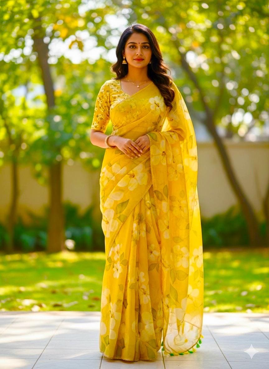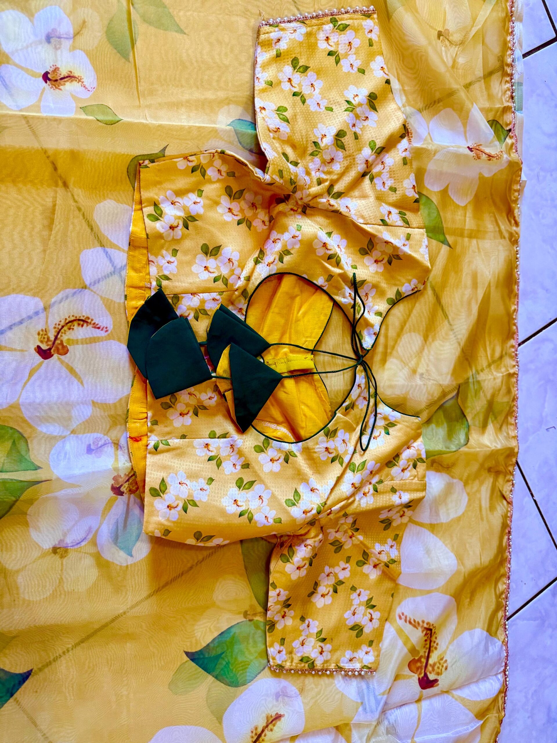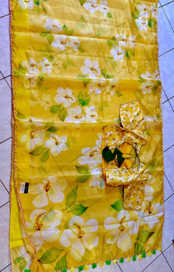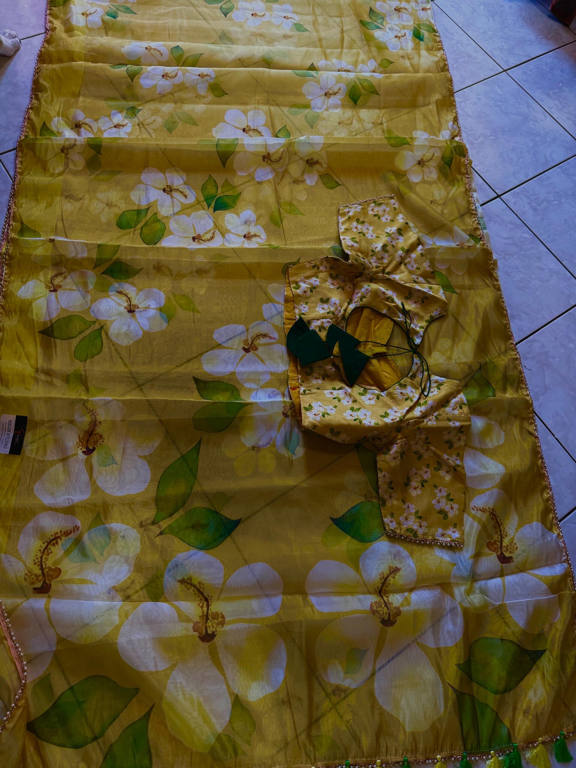 Beautiful organza saree in yellow shade with florals The saree is made of pure silk organza, Pallu, and blouse.