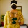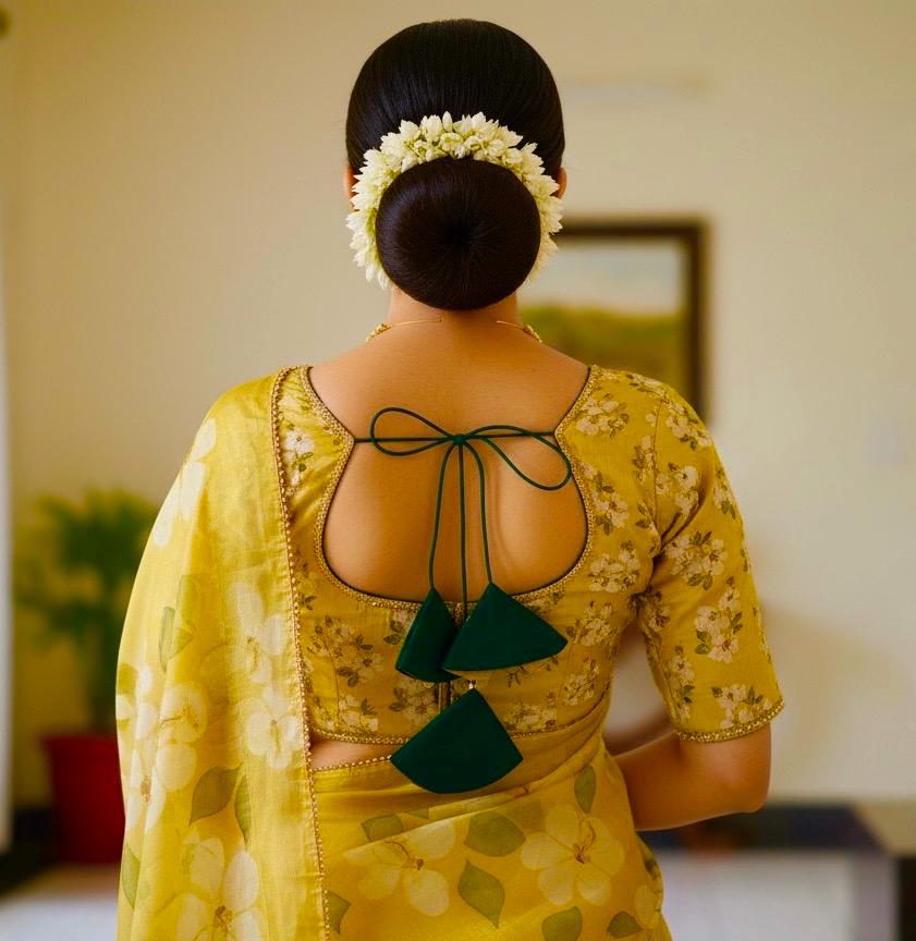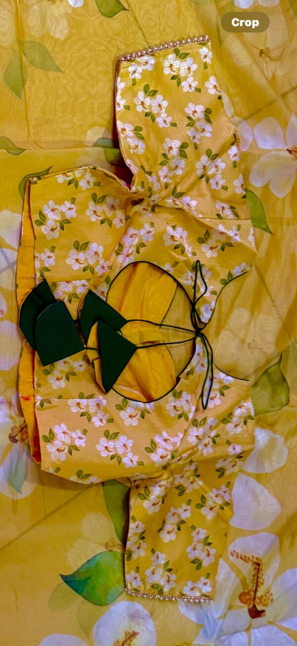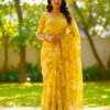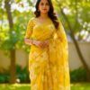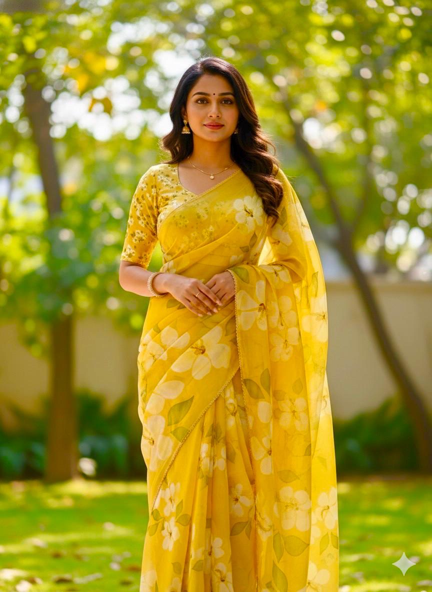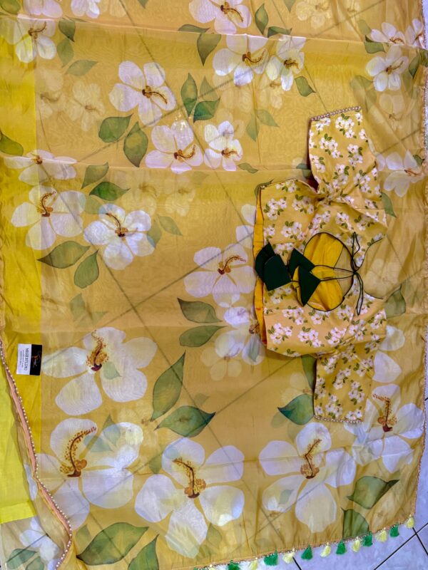 Beautiful organza saree in yellow shade with florals The saree is made of pure silk organza, Pallu, and blouse.
