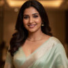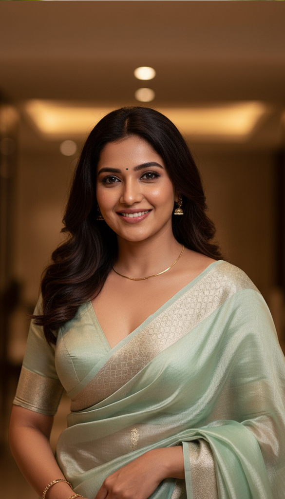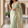 Shimmery Kora tissue saree featuring a rich border and a plain body. This saree can be paired with any contrast blouse, but it also comes with a matching running blouse. The fabric offers the right amount of transparency for a youthful, eye-catching look.
