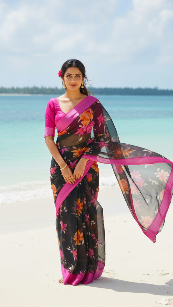 Garden Chiffon Saree. Crafted from a delicate, transparent chiffon, this saree