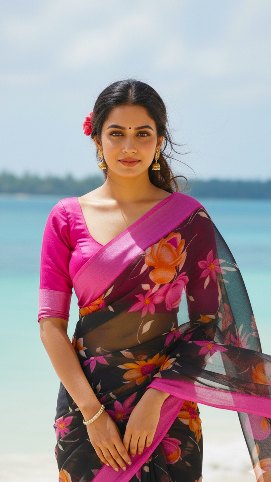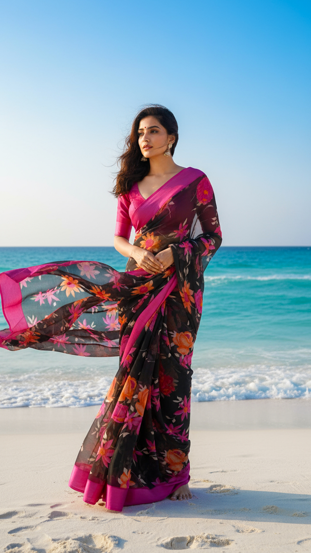 Garden Chiffon Saree. Crafted from a delicate, transparent chiffon, this saree