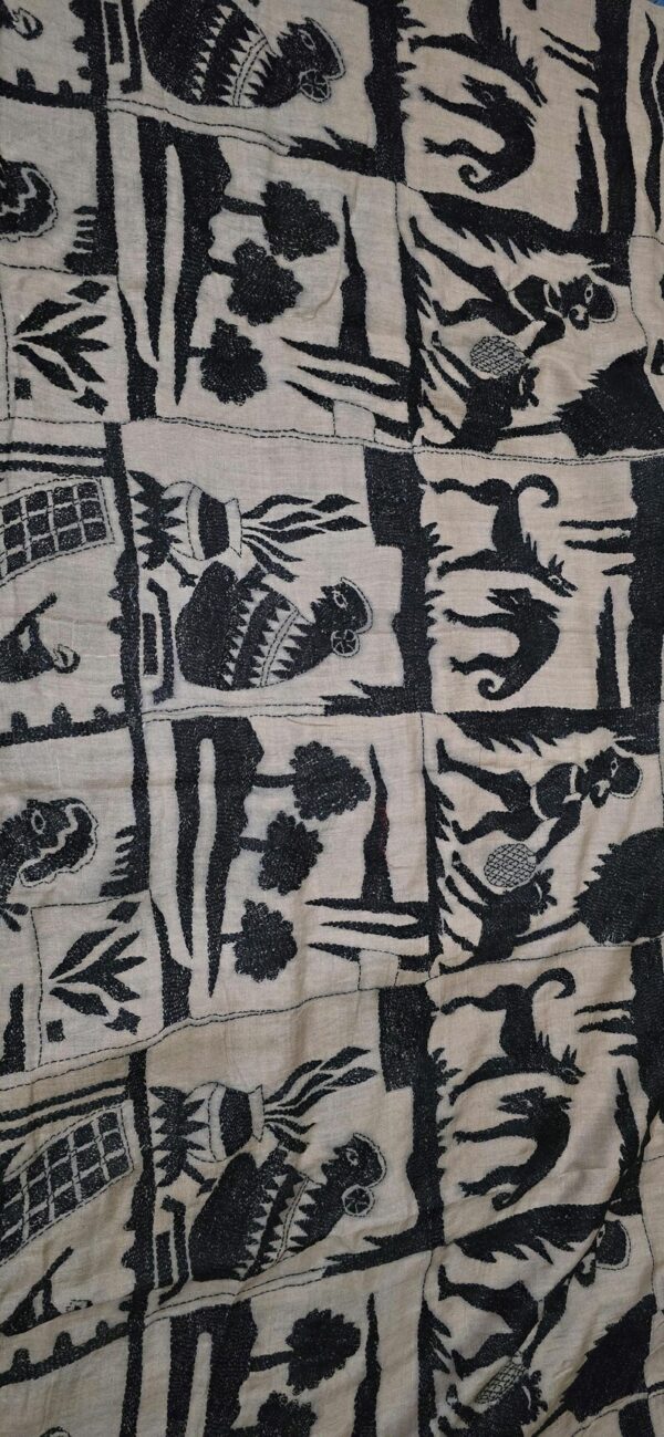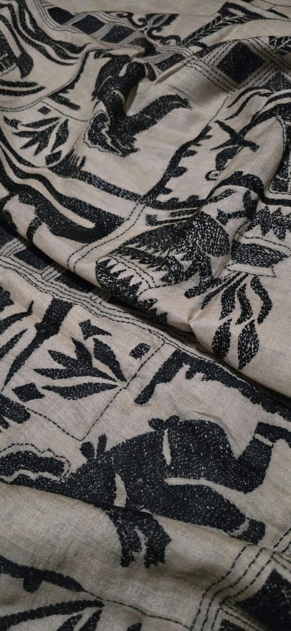 This pure gachi by gachi tussur saree of ours embodies the language learning scripture and imagery with the art form of Hand stitched kantha work all done by our artisans.