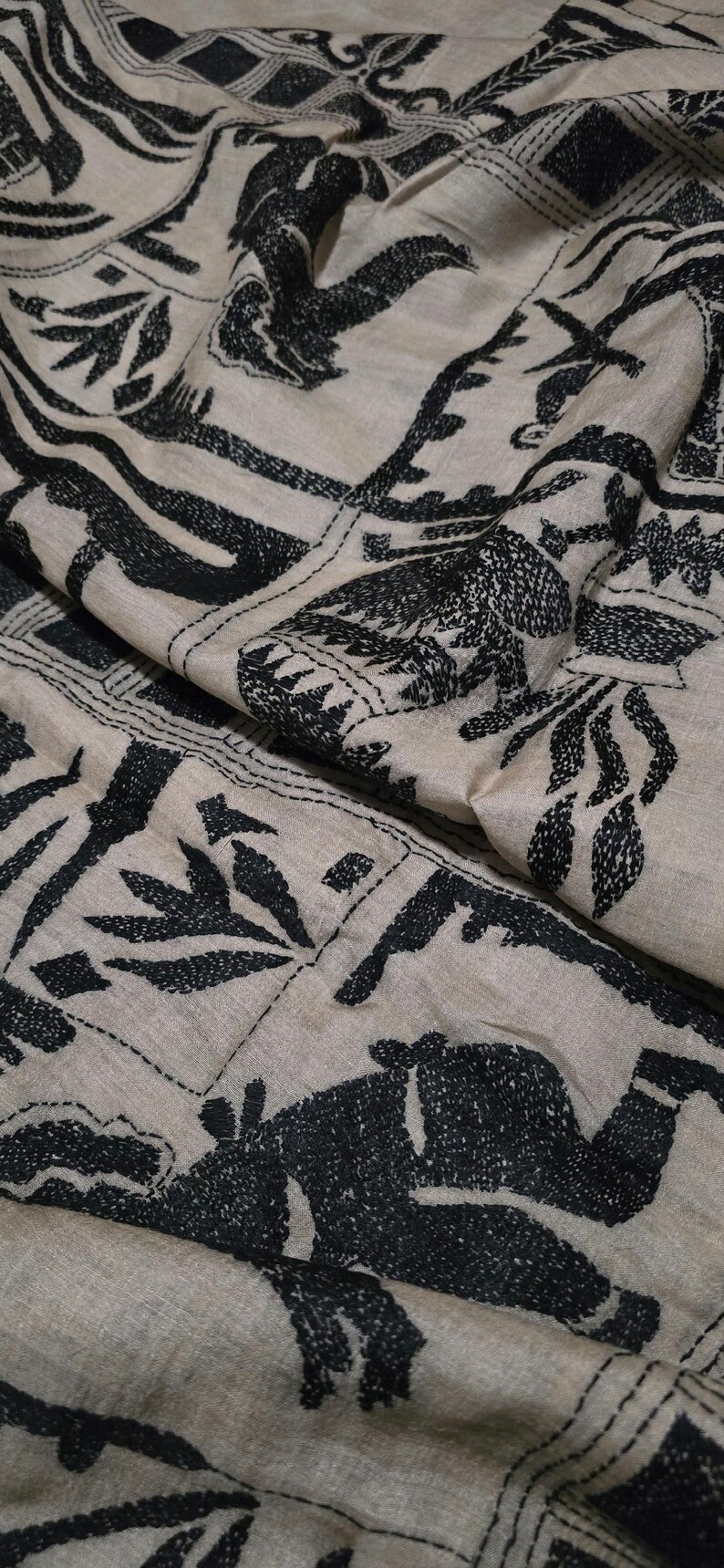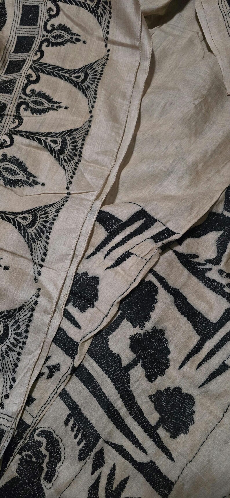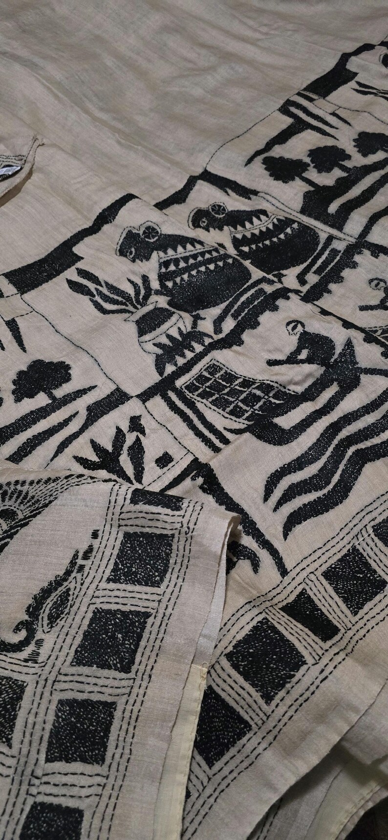 This pure gachi by gachi tussur saree of ours embodies the language learning scripture and imagery with the art form of Hand stitched kantha work all done by our artisans.