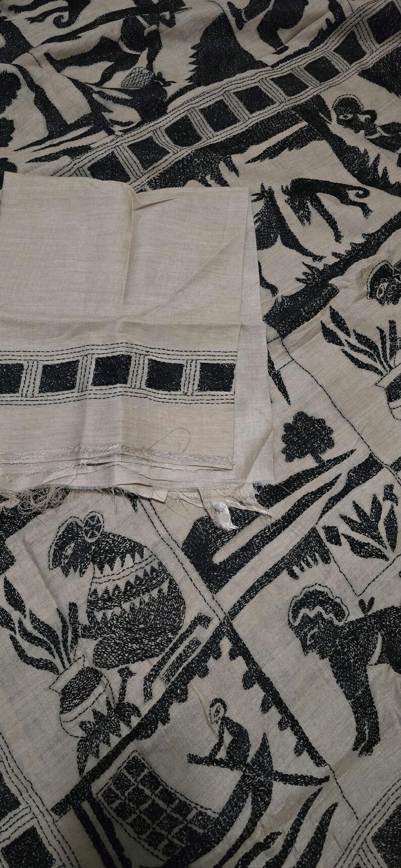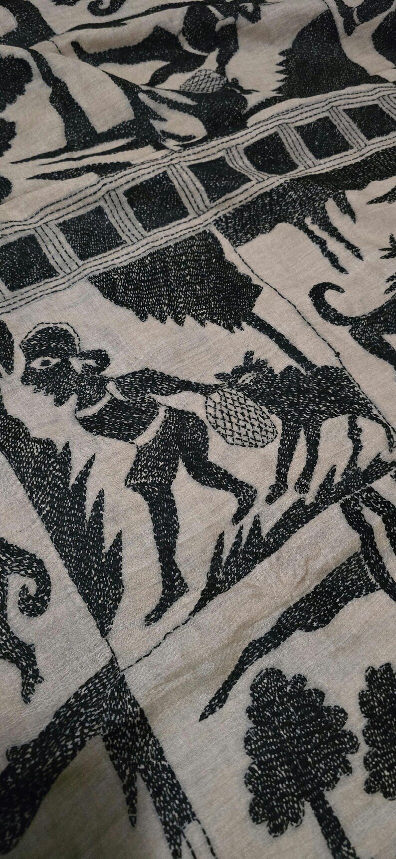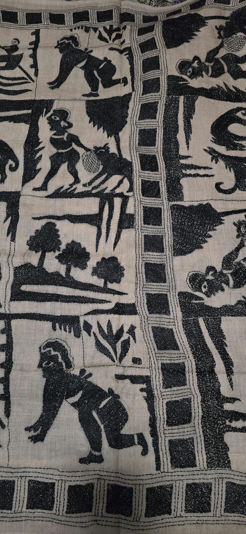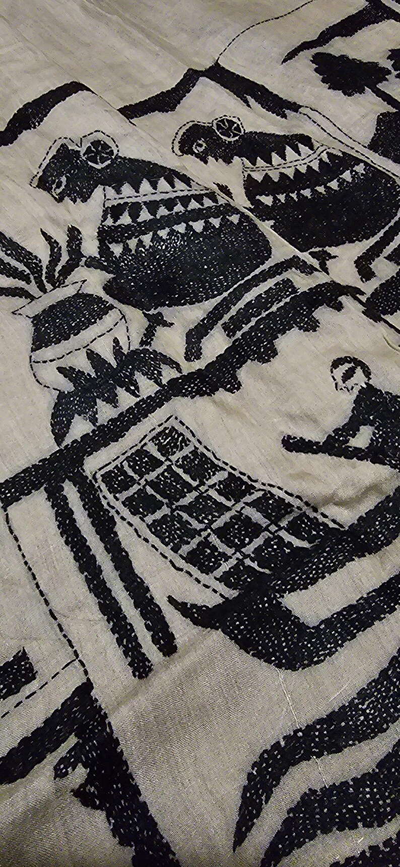 This pure gachi by gachi tussur saree of ours embodies the language learning scripture and imagery with the art form of Hand stitched kantha work all done by our artisans.