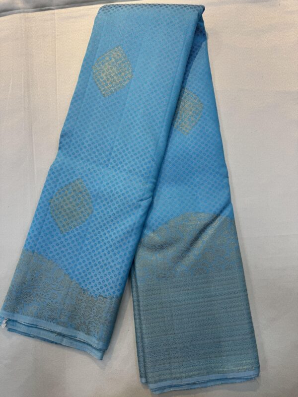 What sets Kanjeevaram silk apart is its unique weaving method where the warp and weft threads are often of different materials—typically pure silk and zari (gold or silver threads)—creating a fabric that is both durable and visually stunning. The zari work in this sky blue variant often features intricate motifs inspired by traditional Indian art—such as temple designs, floral patterns, and geometric shapes—that add depth and richness to the fabric.