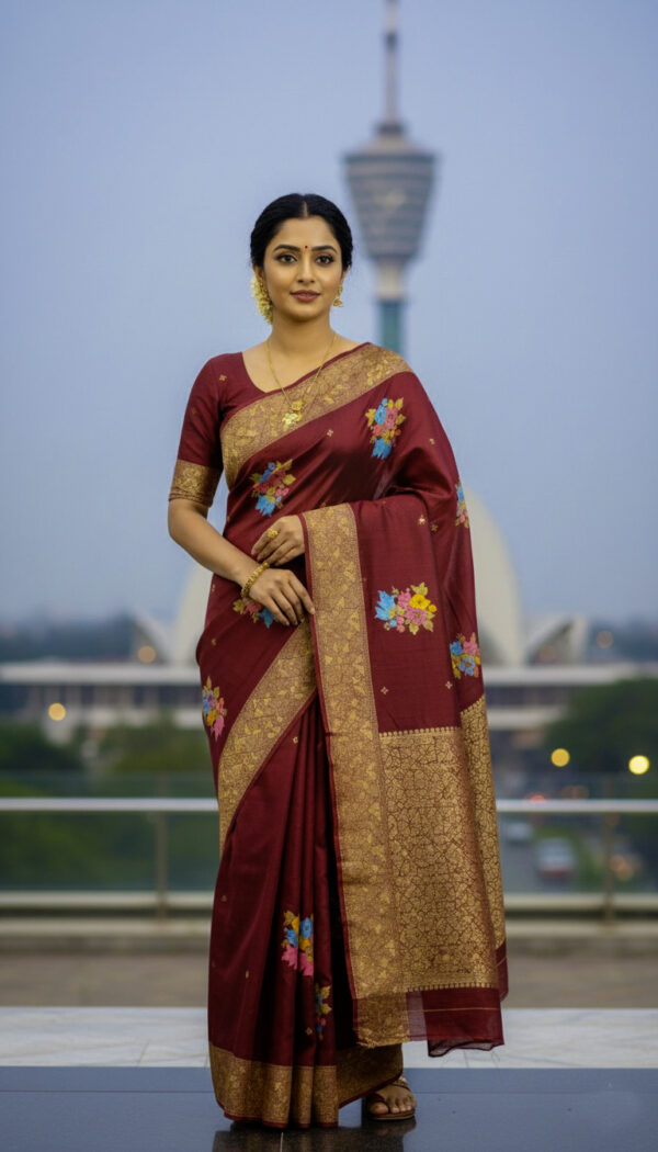 Celebrate tradition with this exquisite maroon silk saree, highlighted by vibrant multicolor floral motifs and a sumptuous gold woven border. The intricate zari work along the pallu and border adds a luxurious touch, making it perfect for weddings, festive occasions, and parties. The coordinated maroon blouse in matching fabric completes this sophisticated look, captured beautifully by the featured model.