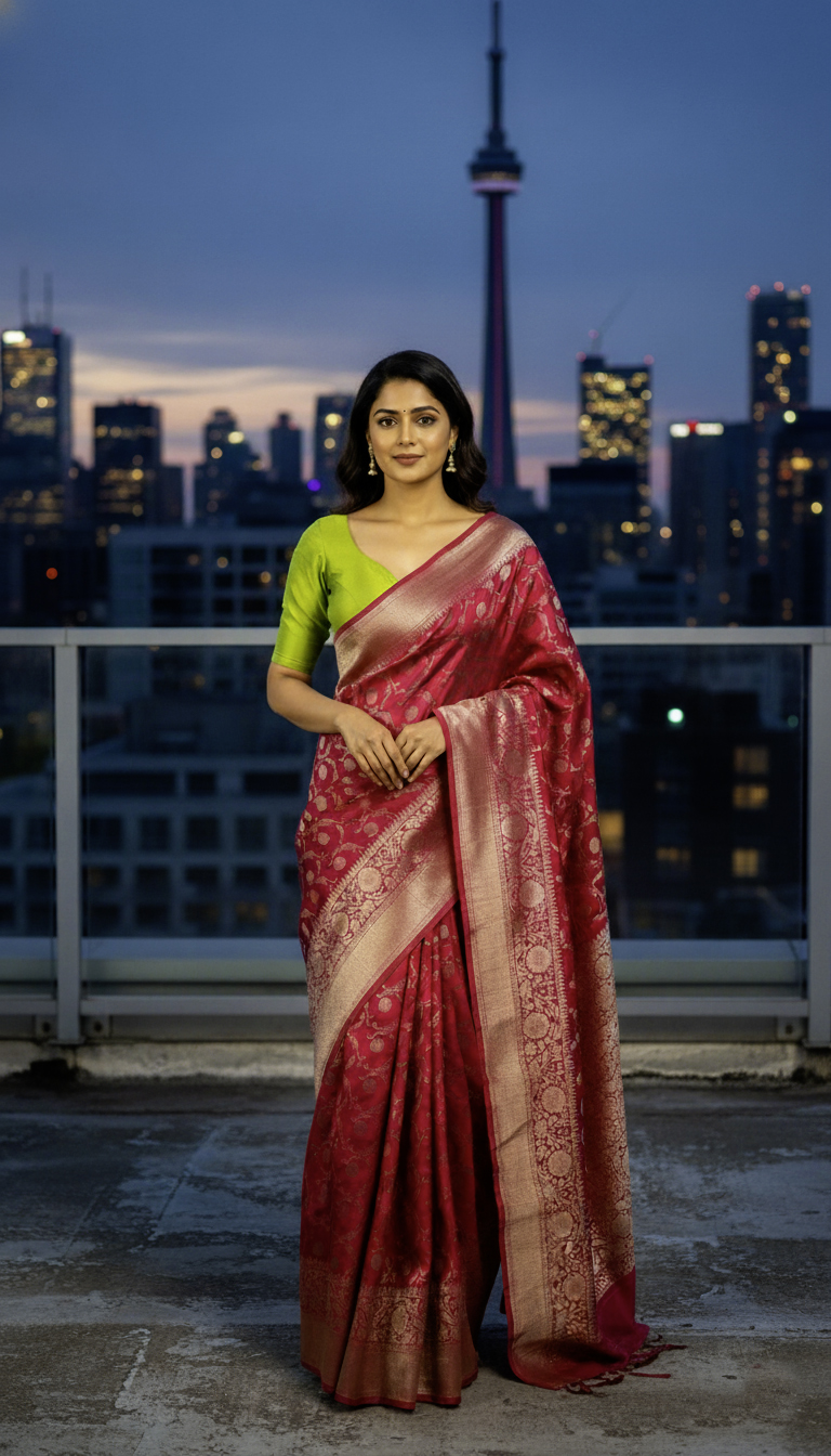 and vine motifs. The rich Banarasi silk offers a majestic drape and a