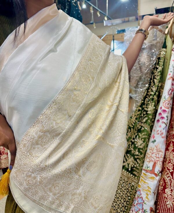 Celebrate tradition with grace in this classic Kerala Malayali white silk saree, featuring the iconic golden zari border that symbolizes purity and heritage. Woven from fine silk, the saree drapes beautifully, offering a rich and regal look perfect for festivals, weddings, and cultural ceremonies. Paired with a mustard contrasting blouse, it adds a vibrant pop of color while maintaining the elegance of traditional attire. This ensemble is a perfect blend of simplicity and sophistication, ideal for those who cherish cultural beauty with a contemporary touch.