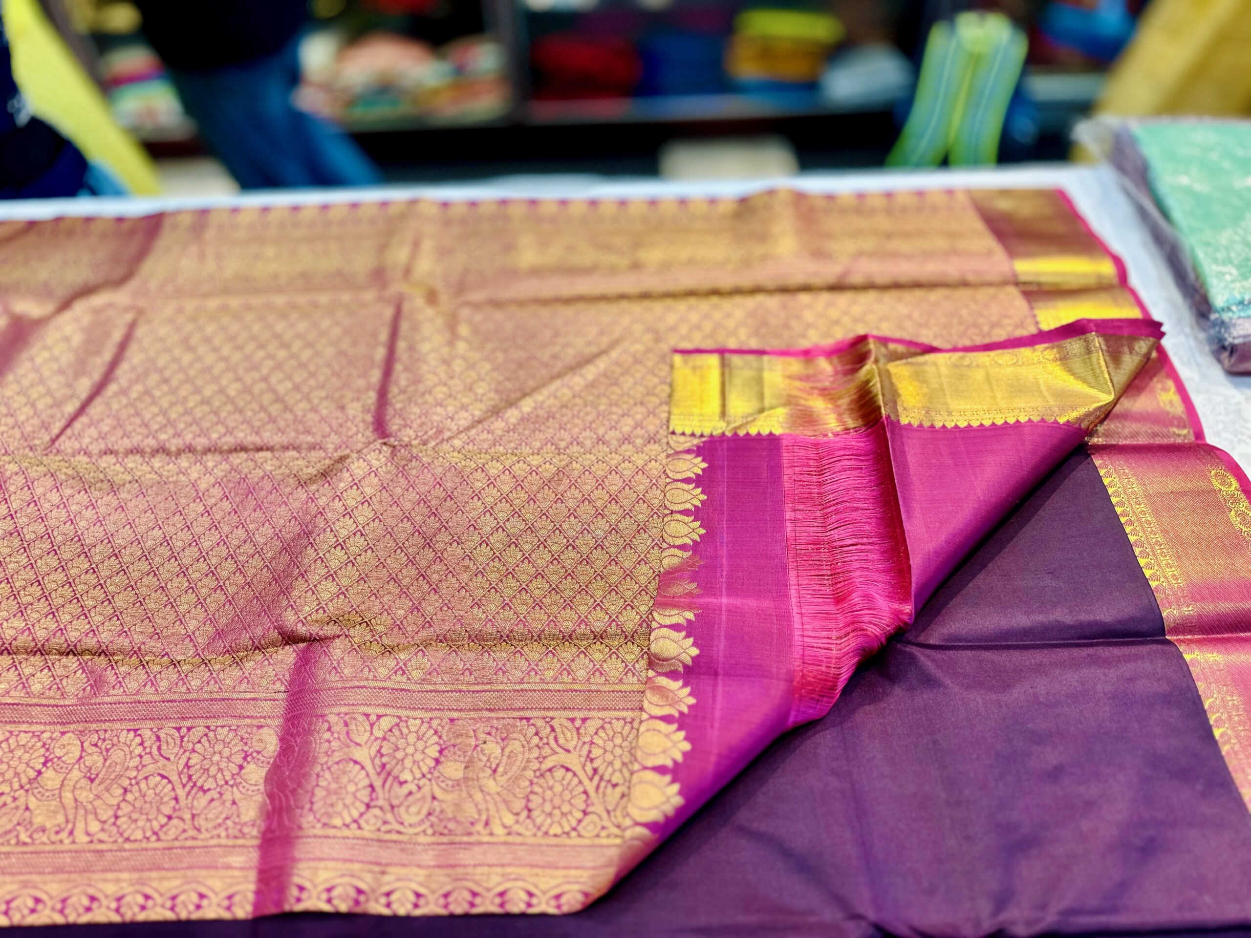 Weave: Authentic handwoven Kanjeevaram weave crafted by skilled artisans from Kanchipuram.