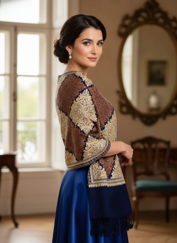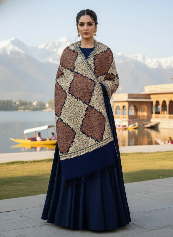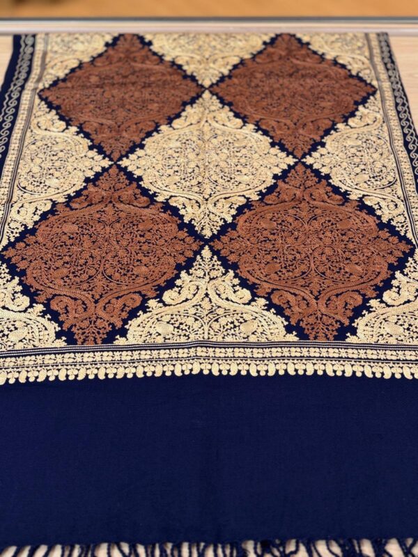 A Kashmir traditional wrap made from wool featuring intricate, colorful embroidery created with a hooked needle called an aari. The designs are inspired by nature and Persian art, often including floral vines, paisley, and Chinar leaves, and are prized for their warmth, luxurious feel, and the detailed craftsmanship passed down through generations