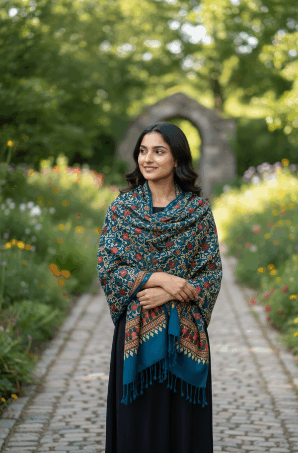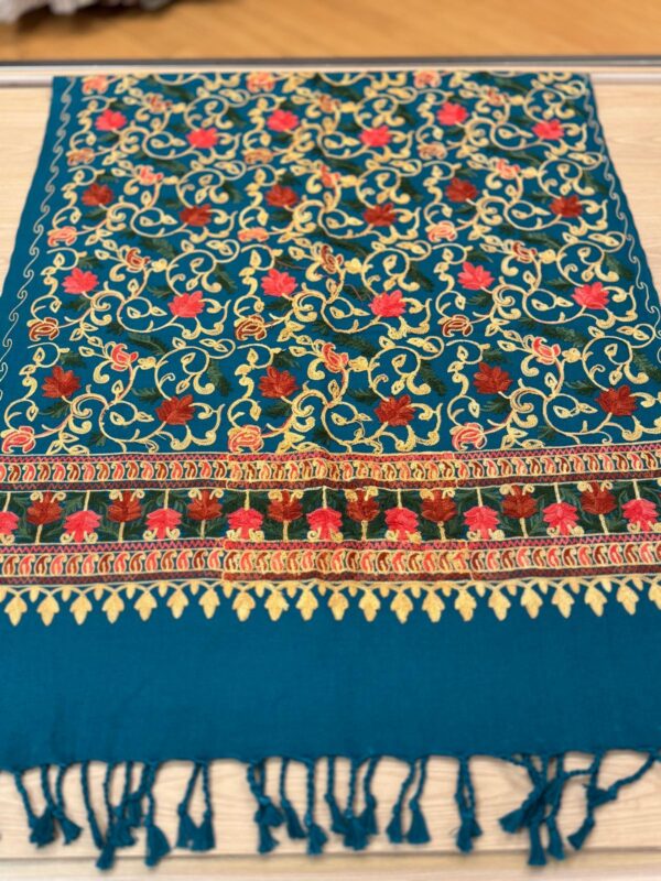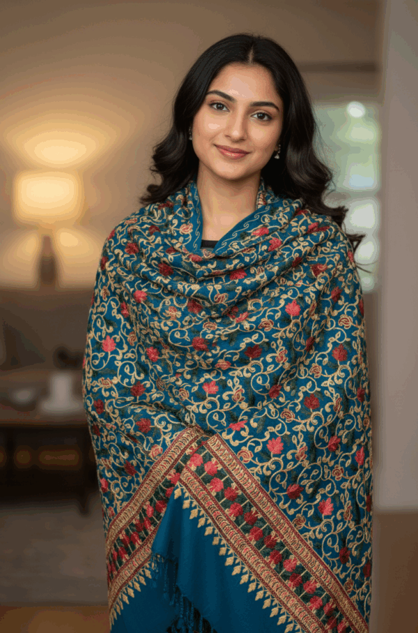 A Kashmir traditional wrap made from wool featuring intricate, colorful embroidery created with a hooked needle called an aari. The designs are inspired by nature and Persian art, often including floral vines, paisley, and Chinar leaves, and are prized for their warmth, luxurious feel, and the detailed craftsmanship passed down through generations