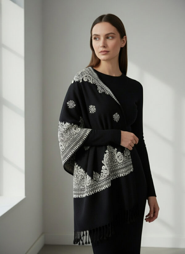A Kashmir traditional wrap made from wool featuring intricate, colorful embroidery created with a hooked needle called an aari. The designs are inspired by nature and Persian art, often including floral vines, paisley, and Chinar leaves, and are prized for their warmth, luxurious feel, and the detailed craftsmanship passed down through generations