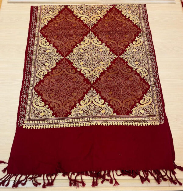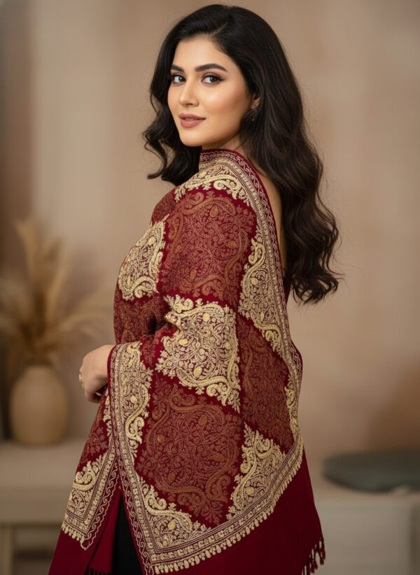 A Kashmir traditional wrap made from wool featuring intricate, colorful embroidery created with a hooked needle called an aari. The designs are inspired by nature and Persian art, often including floral vines, paisley, and Chinar leaves, and are prized for their warmth, luxurious feel, and the detailed craftsmanship passed down through generations
