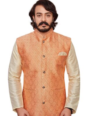 Designer Peach Floral Jacket (Koti) and Pocket Square