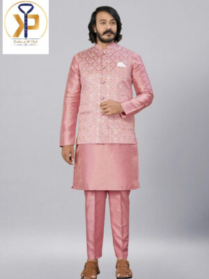 Pink Kurta Pyjama and White Designer Nehru Jacket