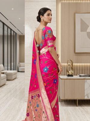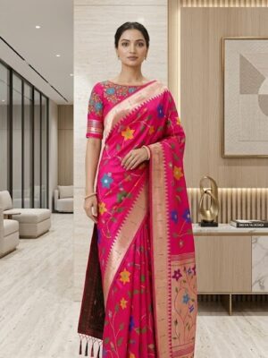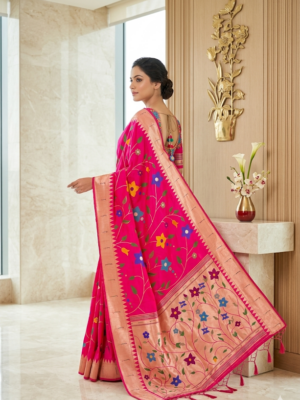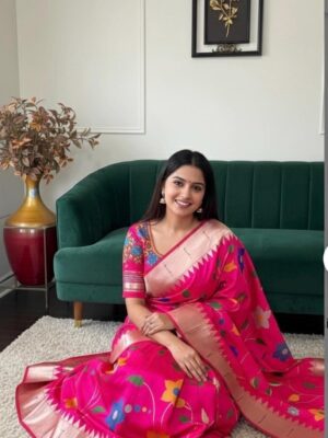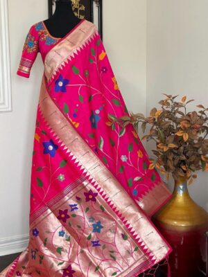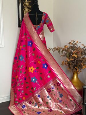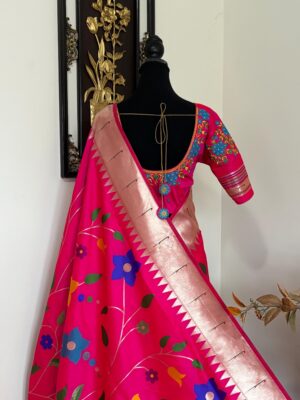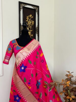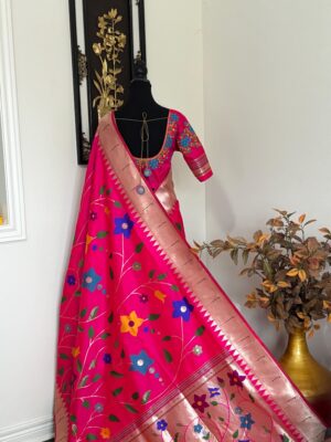 Pink Paithani pythani pure silk saree with all over floral design ready to wear Maggam work blouse fit up to 32 to 46