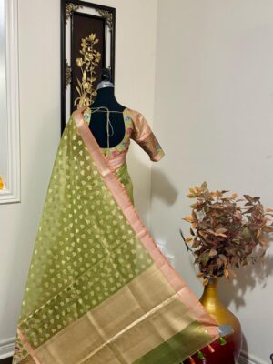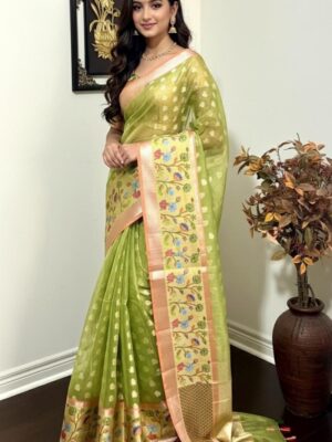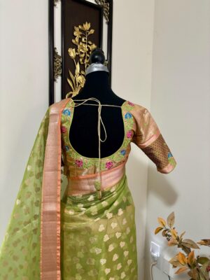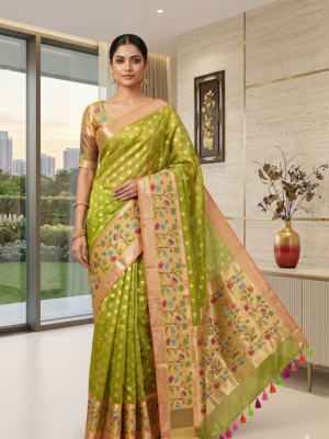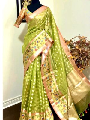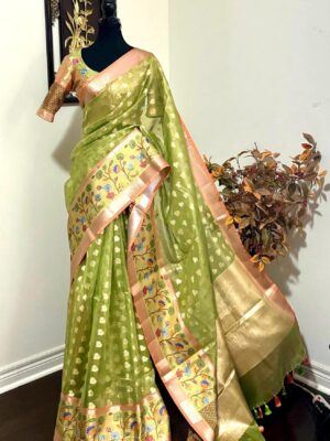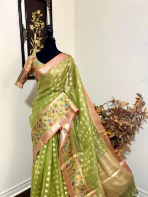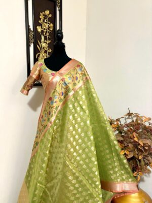 Green Kota Tissue Silk saree with pythani paithani Zari border and beautifully done blouse paired up with pretty blouse fits up to 32 to 46