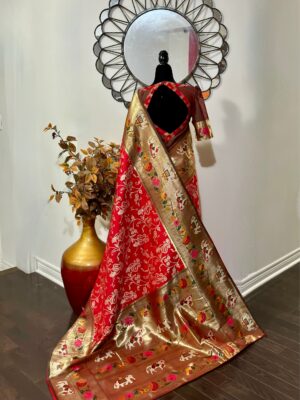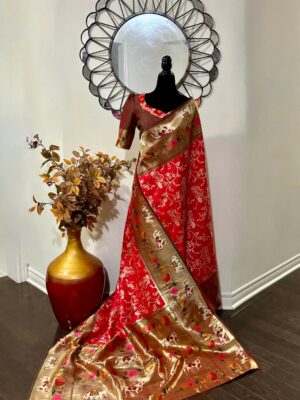 Aqua & Red Gadwal semi Silk Saree with Rich Zari Border
